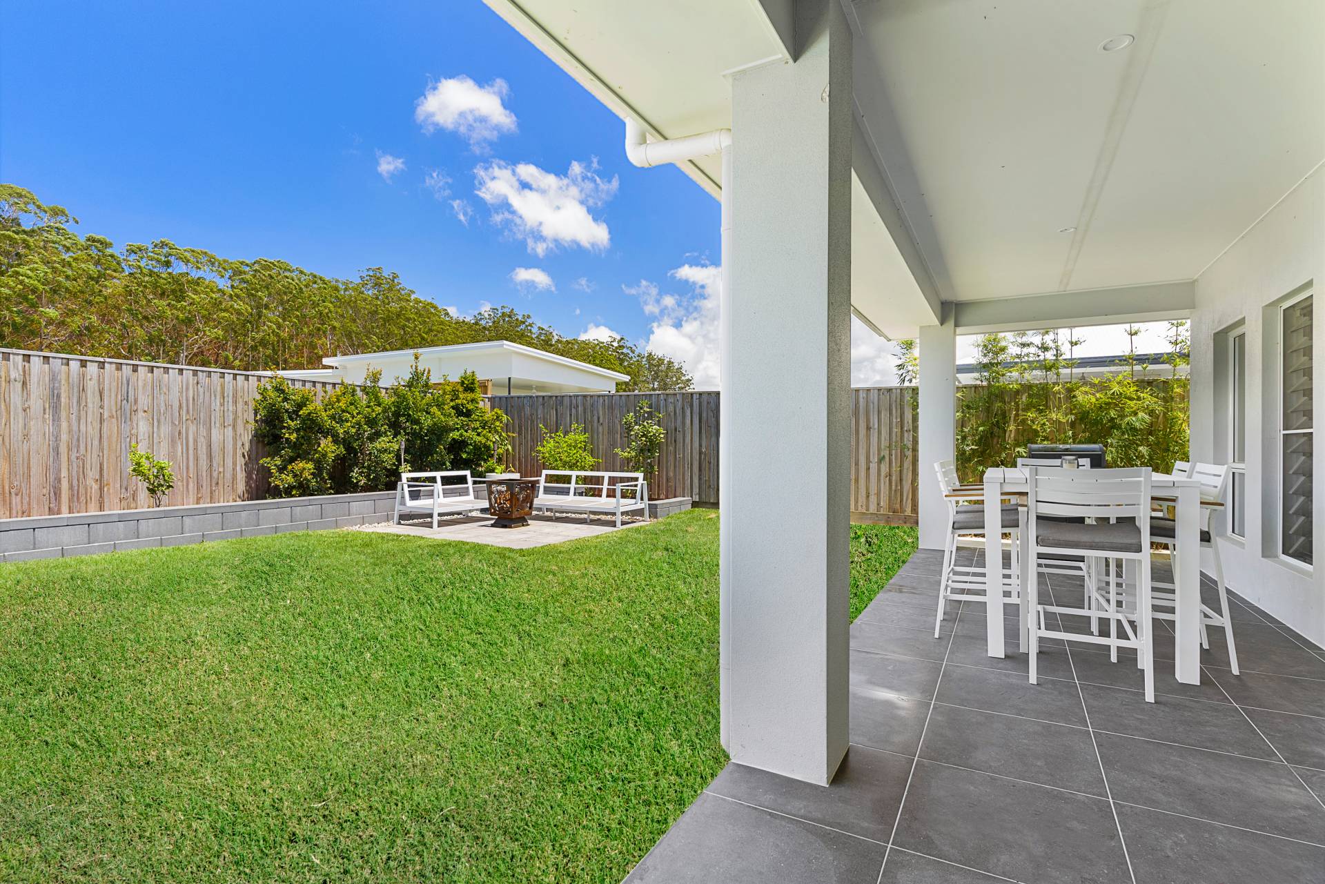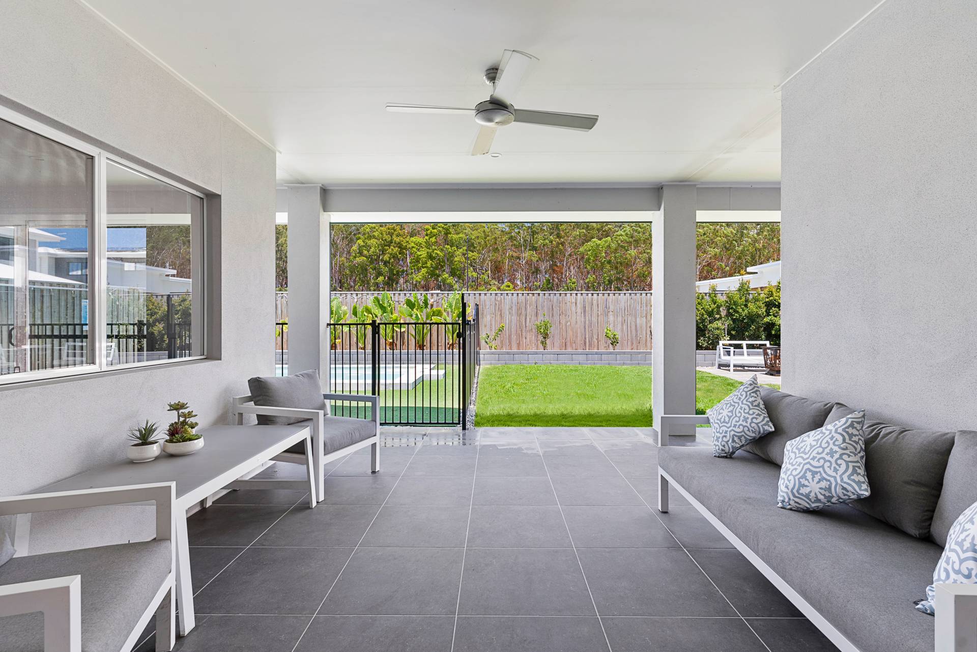 * Tiled alfresco overlooking glistening pool