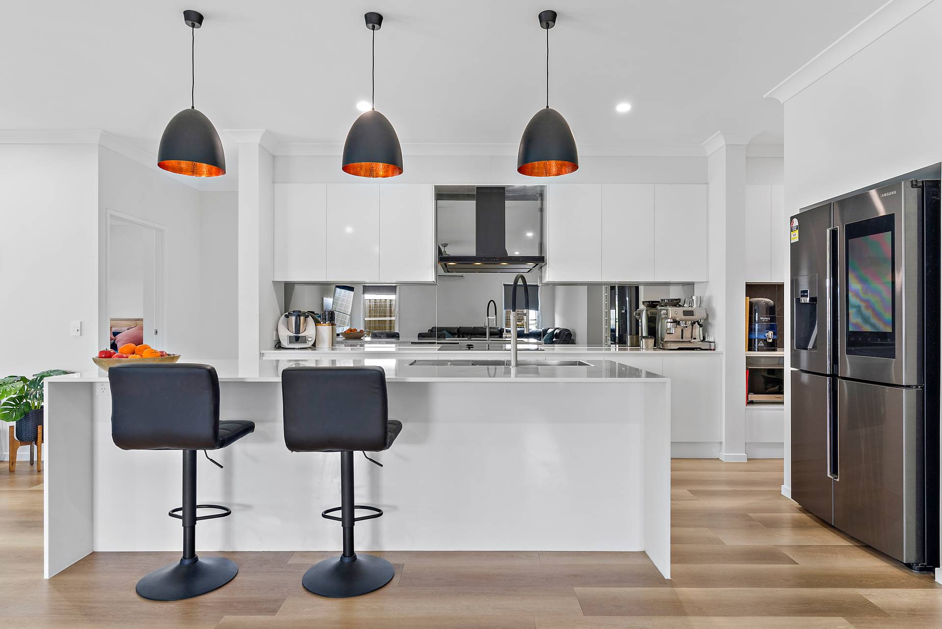 * State of the art kitchen featuring an abundance of space, stone bench tops, mirrored splashback, and pendant lighting over sensationally large breakfast bar