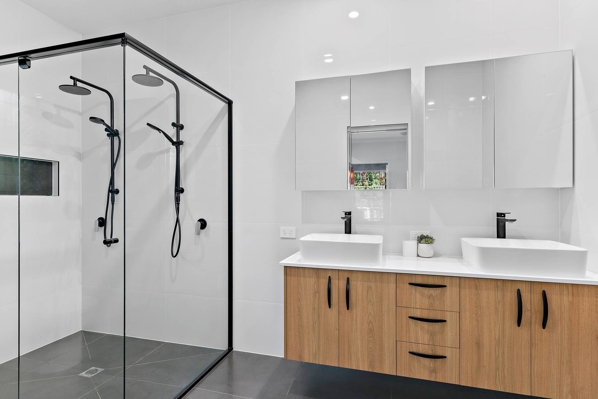 * Grand ensuite boasts with double sink vanity, dual shower with niche, stunning black tap-ware and fittings, floor-to-ceiling tiles and Schweigen silent exhaust