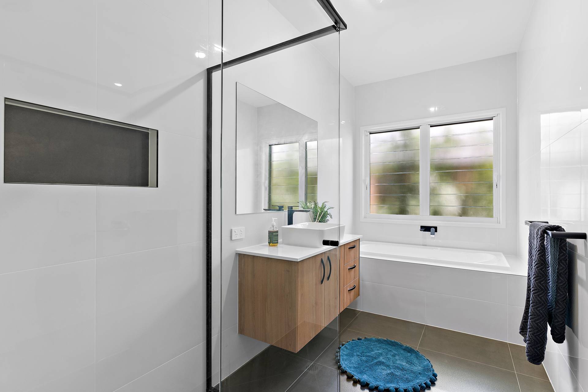 * Immaculate main bathroom complete with floor-to-ceiling tiles, black tap-ware and fittings, bathtub, shower with niche and separate powder room, both with Schweigen silent exhaust.