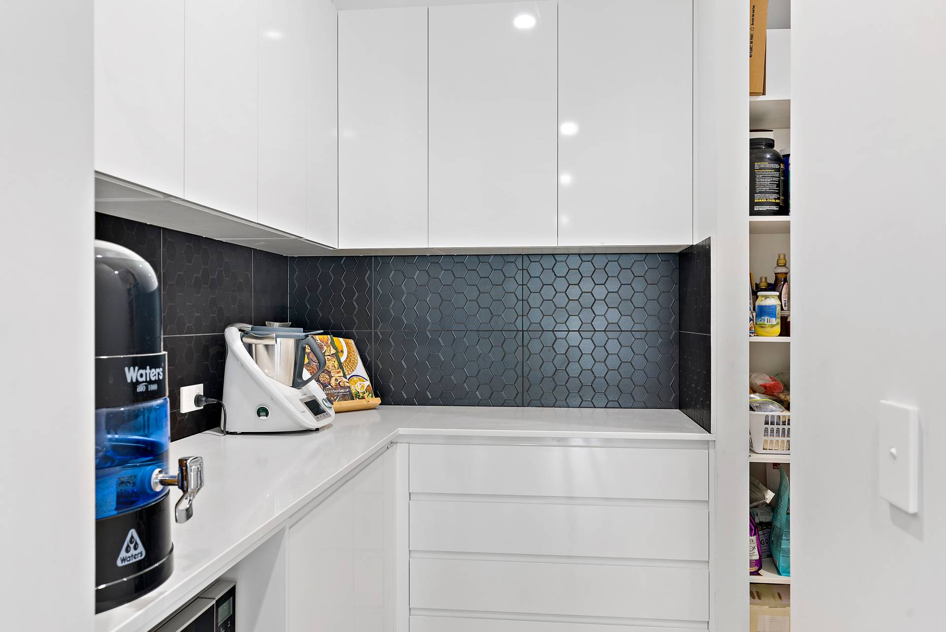 * Butler's pantry with power, microwave niche, bench space, drawers, ample shelving and dual access from hallway