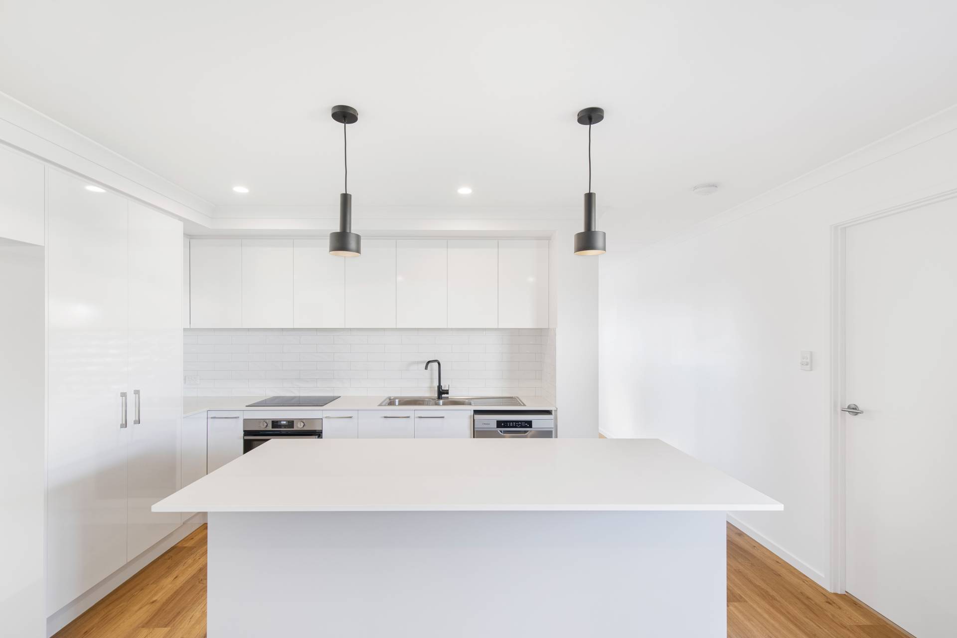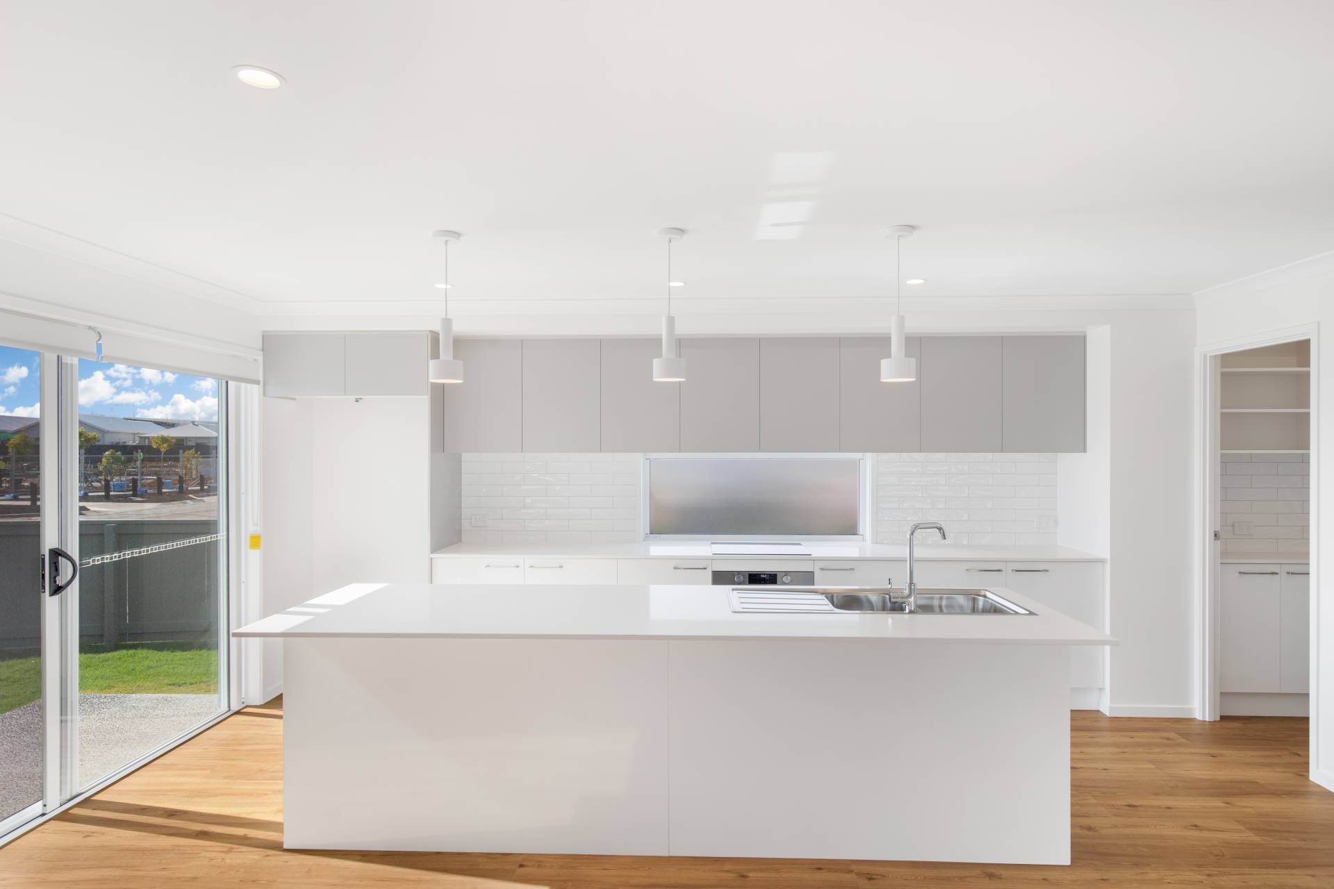 Large kitchen boasting custom designed and made cabinetry, stone bench tops with 900mm wide island bench, pendant lighting, soft-close drawers and Westinghouse appliances