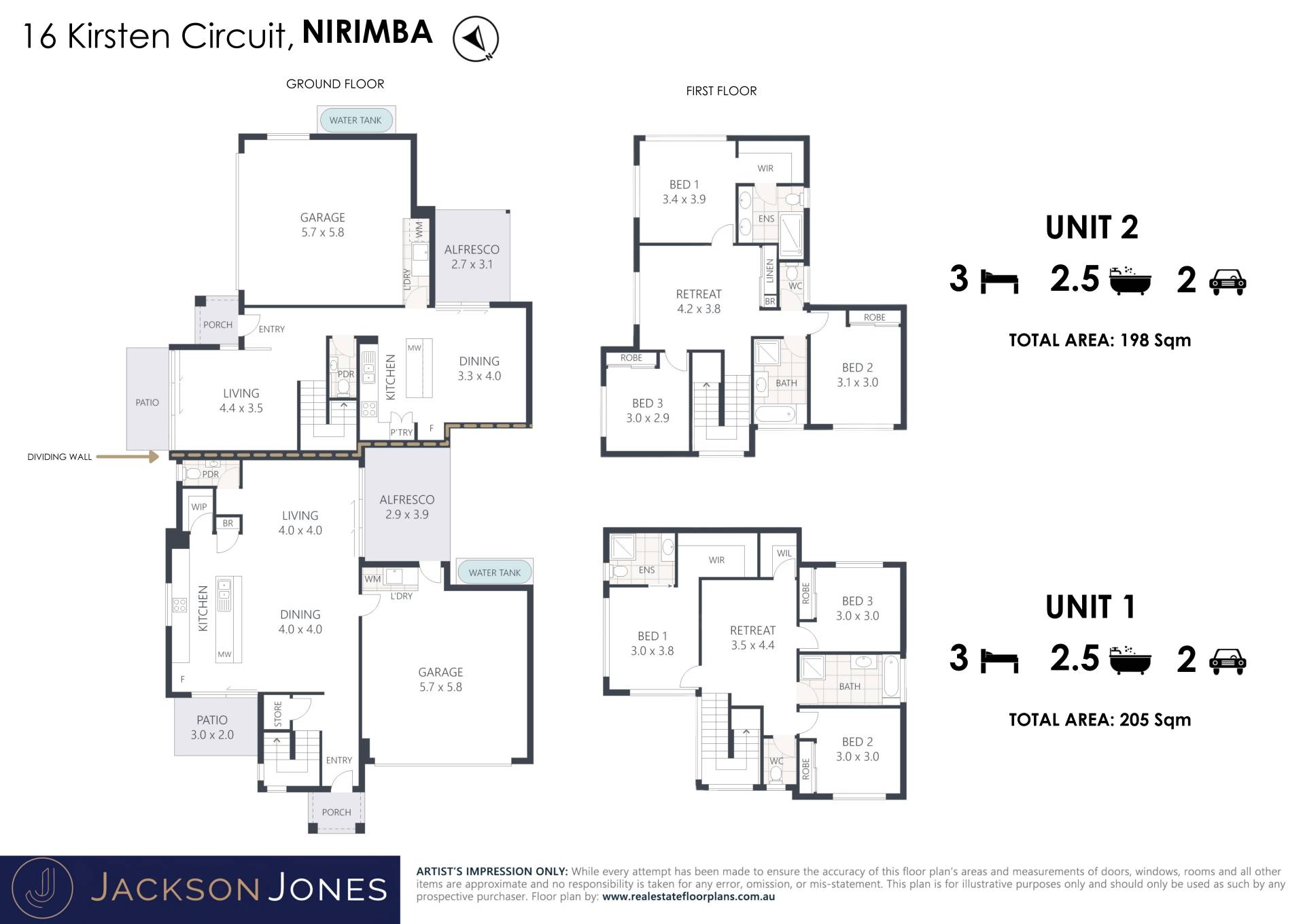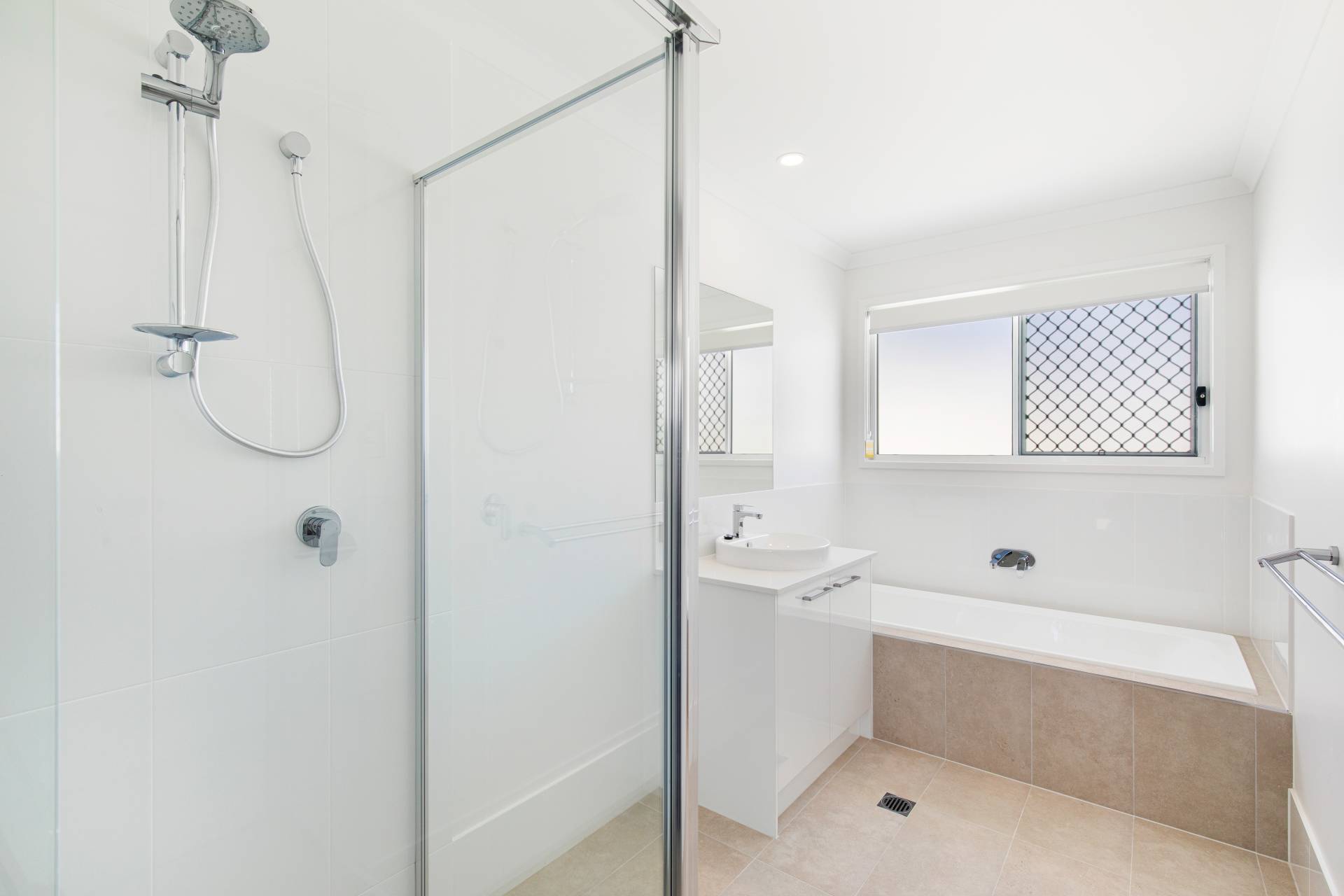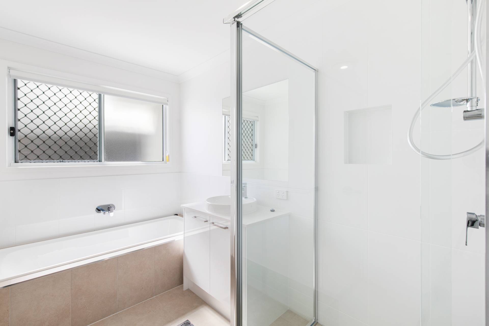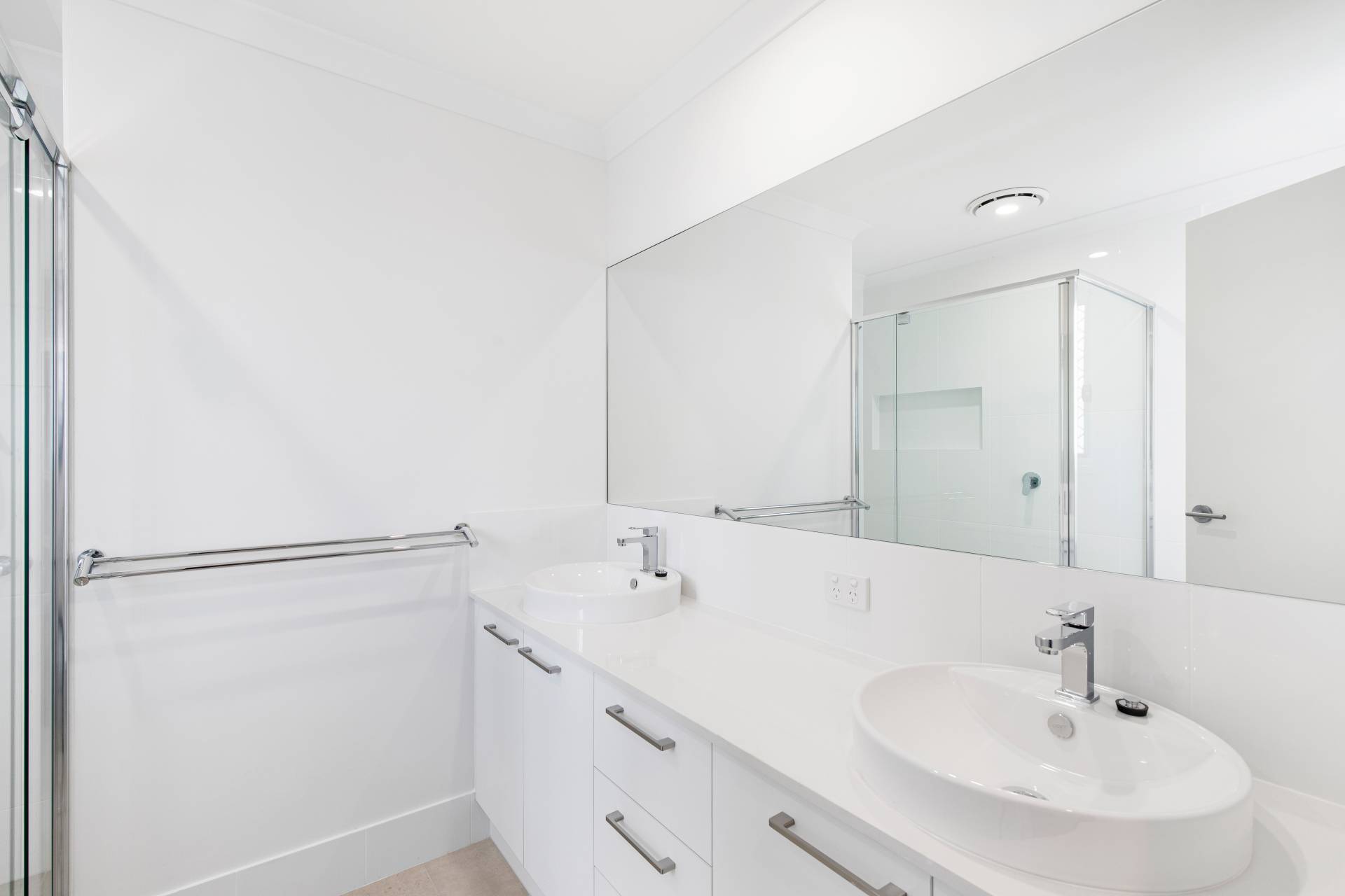 Two well-appointed bathrooms with custom designed and made vanity, stone bench tops, frameless mirror, shower niche and 2m high wall tiles to showers
