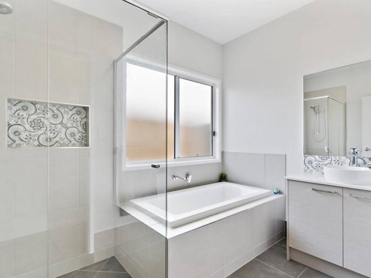 Both bathrooms and the separate laundry pride reconstituted stone bench-tops and a stunning feature tile splash back.
