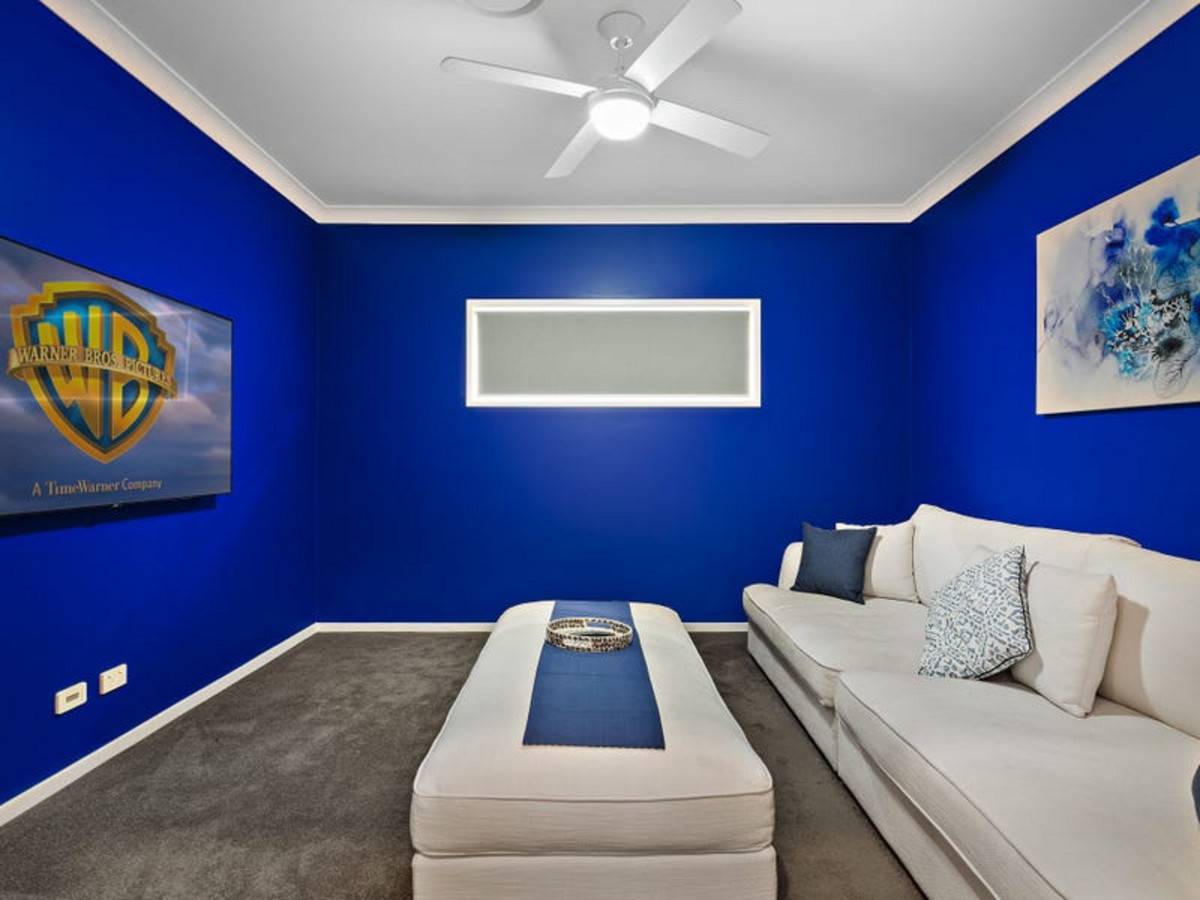 The media boasts a deep royal blue palette, roller blind and pocket doors ideal for closing the space for a movie night. The multi-purpose room offers a third living space, perfect for a home office or kids retreat with built-in shelving with VJ wall panelling.