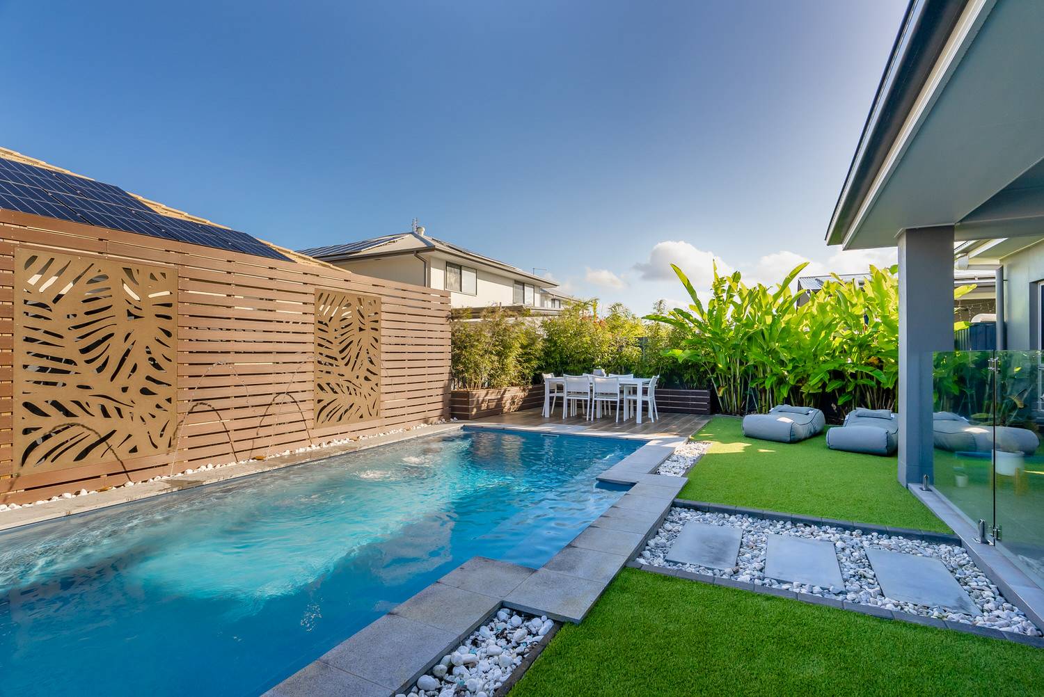 Balcony Deck Fenced Outdoor entertainment area in-Ground Pool Water Tank Grey Water System Solar Panels Study