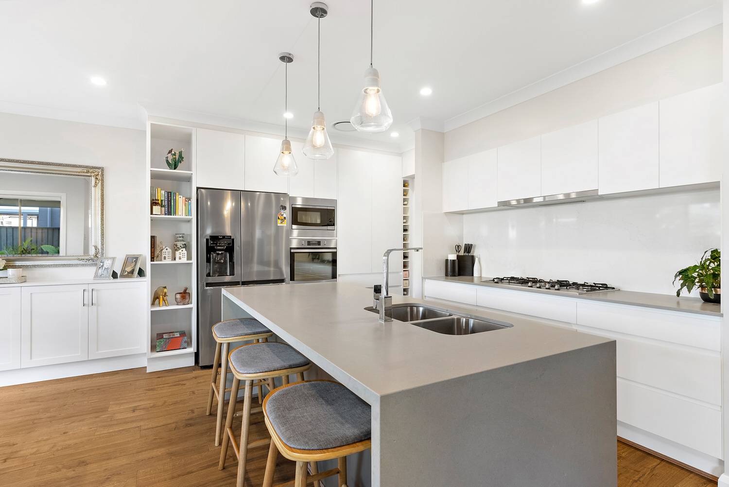 This spectacular open-plan design epitomizes modern living with space aplenty. The large kitchen is a triumph in design and sure to be the envy of all dinner guests. Boasting stone bench-tops, modern appliances, chic' marble splash-back, butler's pantry, wine storage and views to the pool; this is the ideal space for creating all things culinary. Glass pendant lighting over the breakfast island create a sense of opulence that flows through to the dining area. The built-in sideboard with marble bench top provides excellent storage and frames this warm dining space. Throughout the home sophistication is drawn from the high ceilings, wood effect flooring, luxe carpeting and a refined colour palette. From the lounge, glass sliding doors open onto an expansive tiled alfresco overlooking the garden and glistening pool. The backyard has been thoughtfully landscaped to create multiple living zones including leafy sundeck dining, pool lounging and covered alfresco entertaining.
