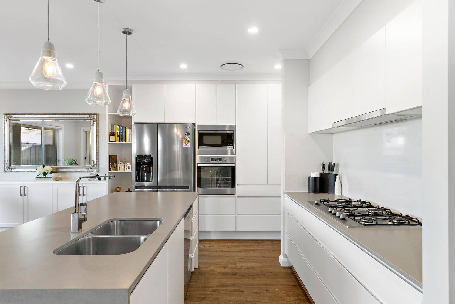 • Modern kitchen with stone benchtops, modern appliances, gas hob, pendent lighting and butler's pantry
