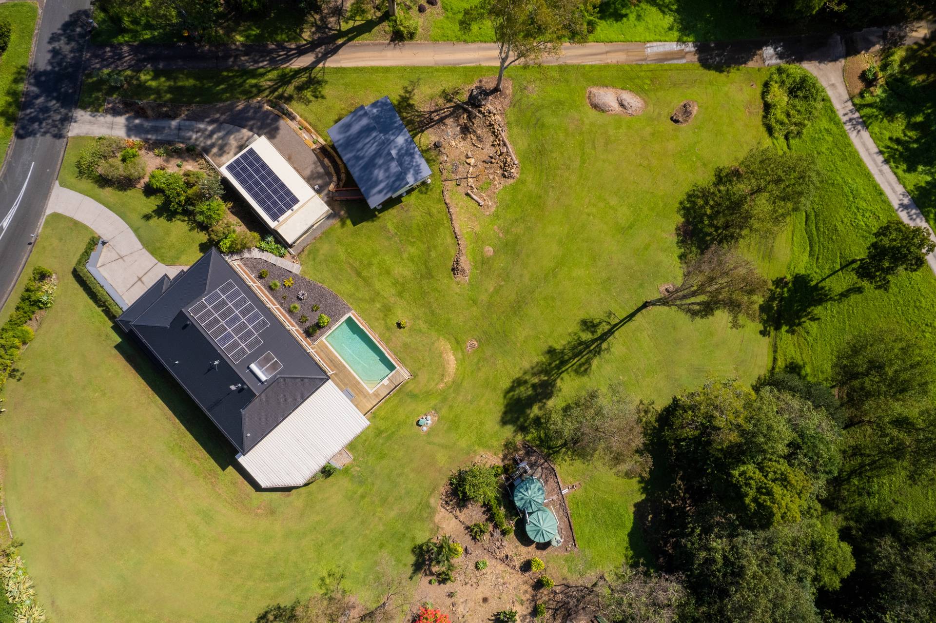 Deck Outdoor entertainment area in-Ground Pool Water Tank Solar Panels Study