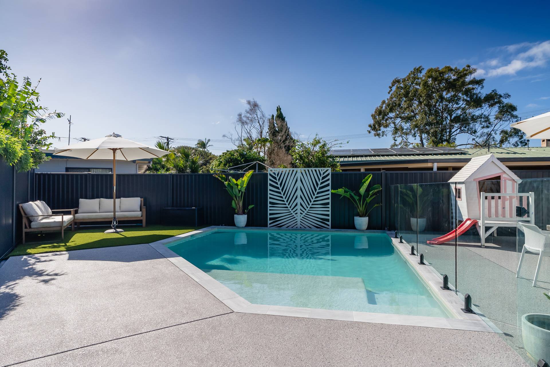 Outdoors is another huge entertaining space overlooking the immaculate in-ground pool. The pool is cleverly designed with a large shallow shelf, perfect for children or sipping cocktails in beautiful temperate water! Within the pool area, there is yet another space to relax by the water under a beach umbrella or soak up the sunshine on a pool lounger. Encapsulating privacy, the backyard is fully fenced with colorbond; ideal for children and pets to play safely, as well as offering low-maintenance, luxury living.