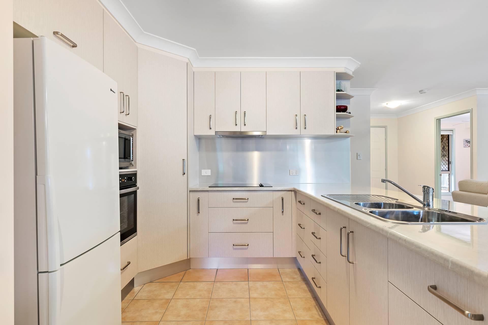 - Modern kitchen with stainless steel splash backs and kickplates