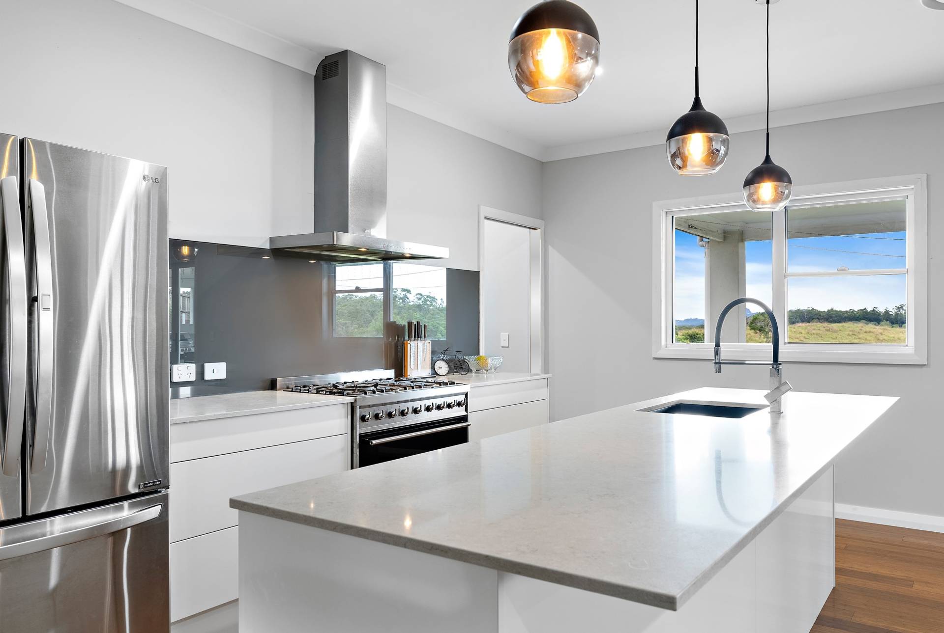 - Contemporary kitchen with sizeable butler's pantry. Features Roman stone countertops and 900mm, 6-burner Smeg gas hob and electric stove.