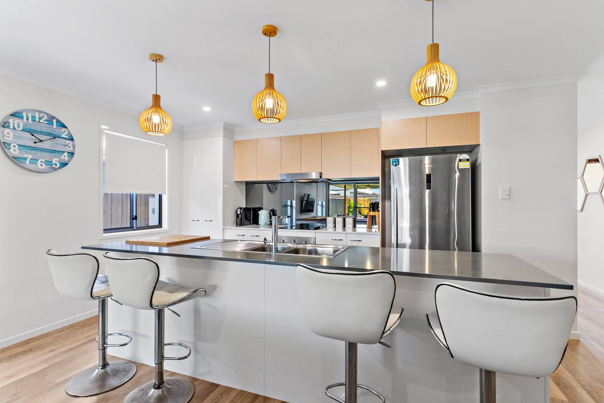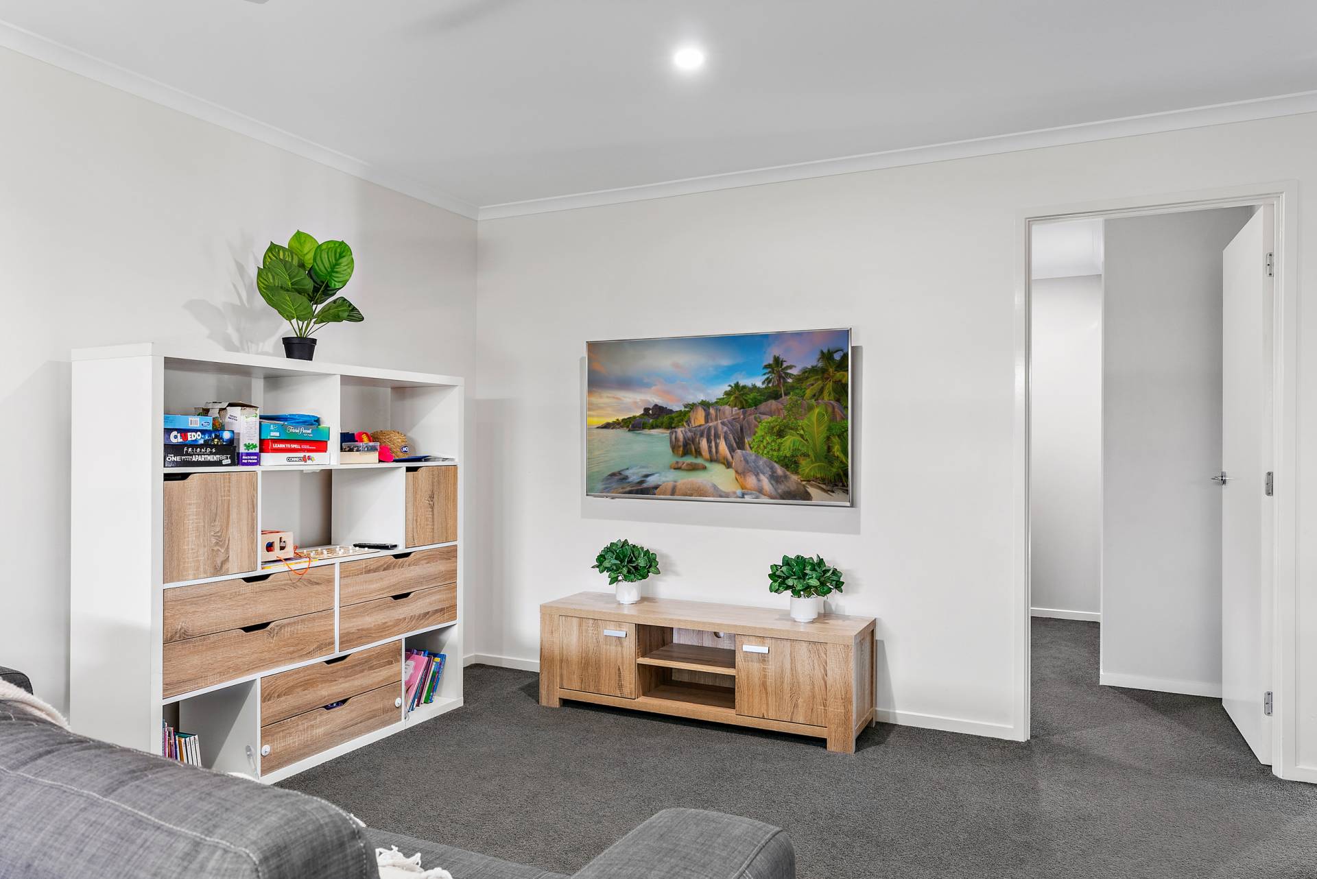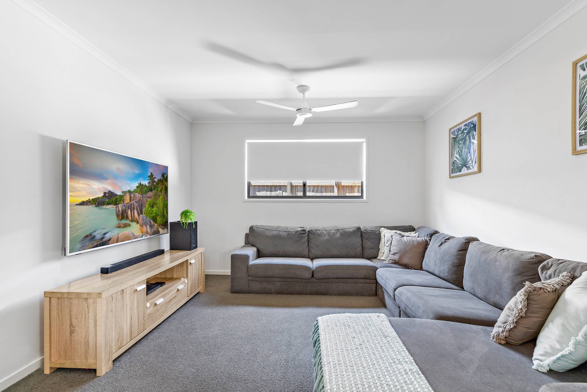 Impeccably presented and in immaculate condition, this four-bedroom home is an absolute must see! Opening onto wide hallways, wood effect vinyl planking, decorated by a stunning, lit wall niche you are welcomed into this beautiful family home. The open-plan living space includes spacious kitchen, dining and living that flows out to a relaxing, covered alfresco and landscaped backyard. Enjoy the fully fenced green space, perfect for children or furbabies to safely play! The impressive kitchen is well-equipped with reconstituted stone bench tops and stunning pendant lighting over the island bench. The media room is centrally located with double sliding panelled doors for added privacy.