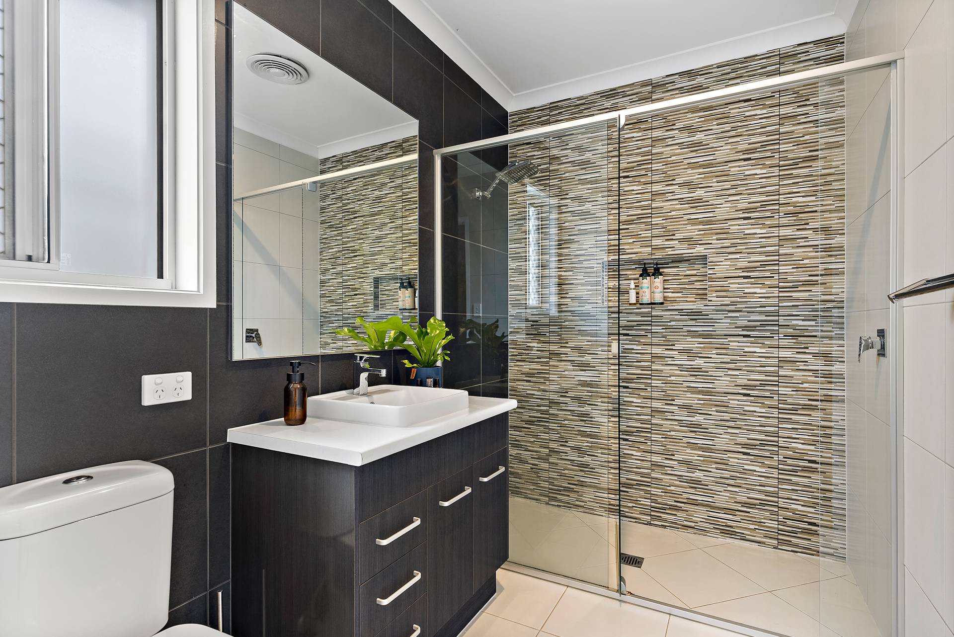 Ensuite bathroom with floor-to-ceiling tiles and shower niche
