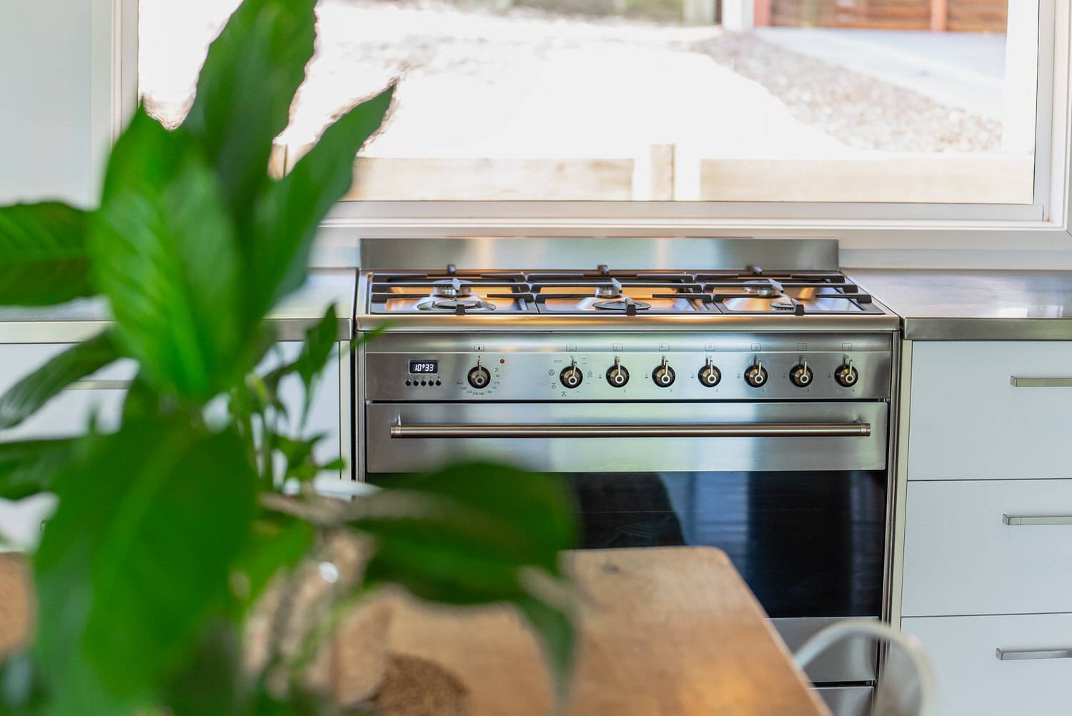 Inside, polished grey gum timber floors, high ceilings and gorgeous country vistas feature throughout the downstairs living space. There's a proper farmhouse table here, within a chic low-key kitchen that includes stainless countertops, a 900mm Smeg 6-burner gas top electric oven, Smeg dishwasher and roomy butler's pantry.