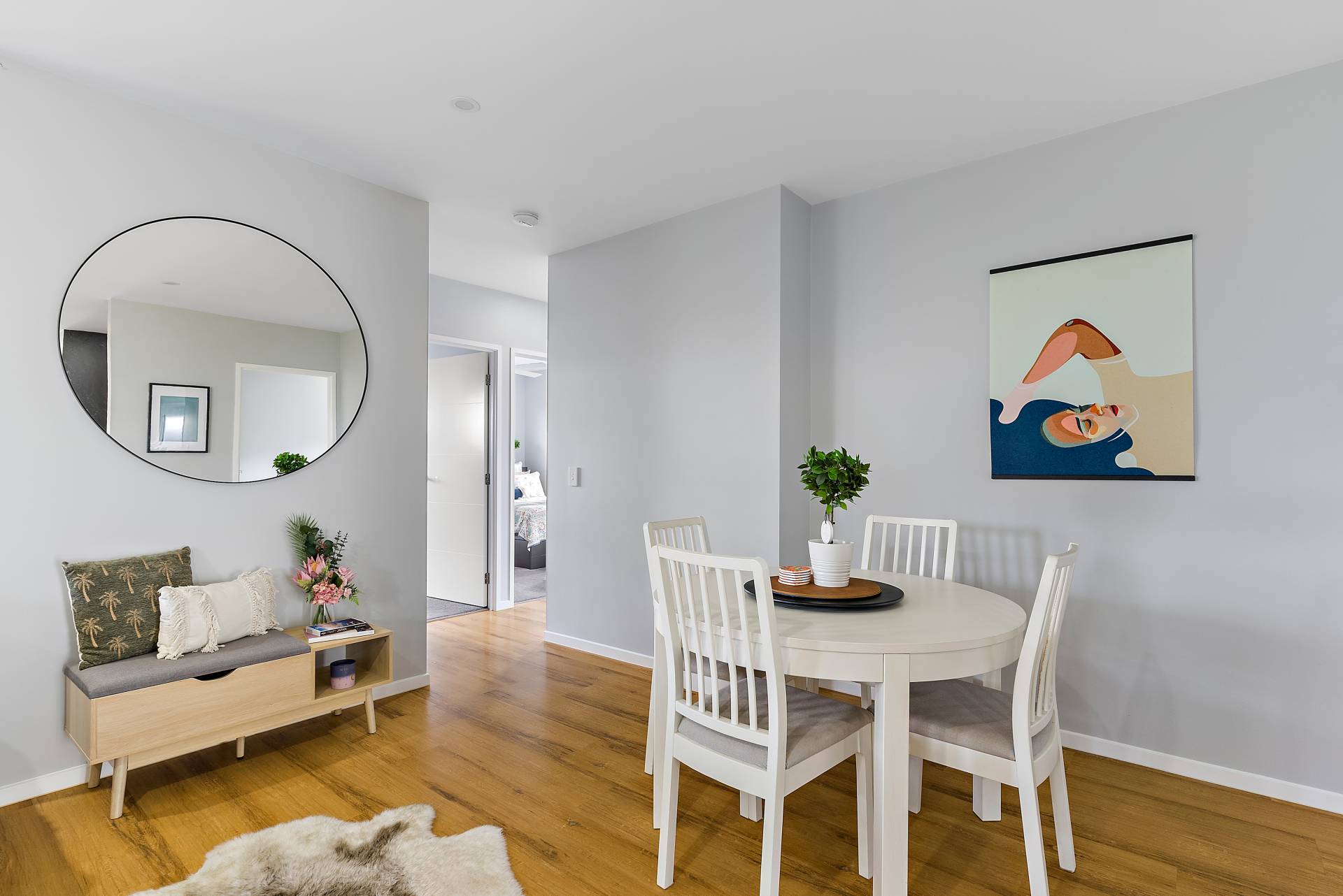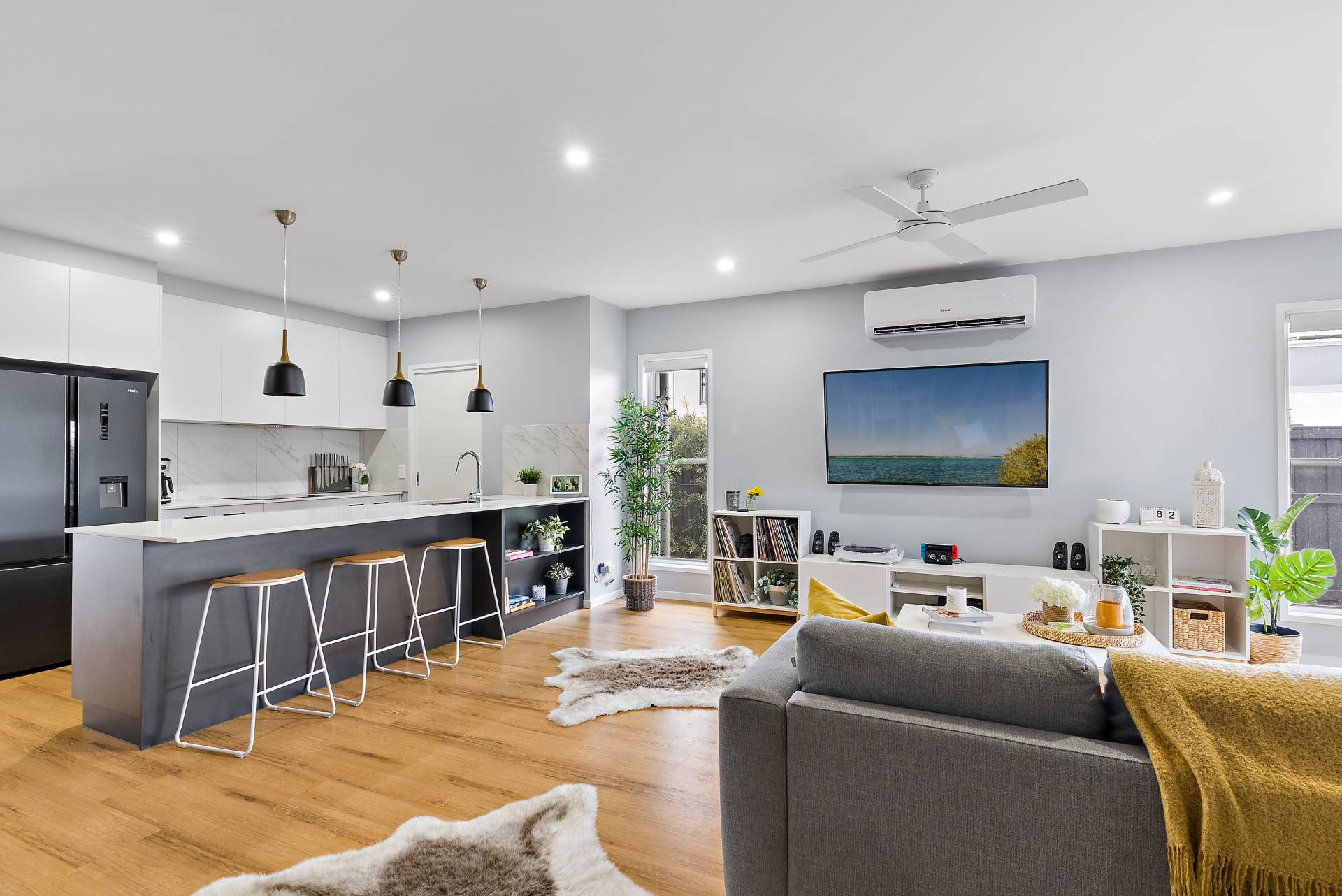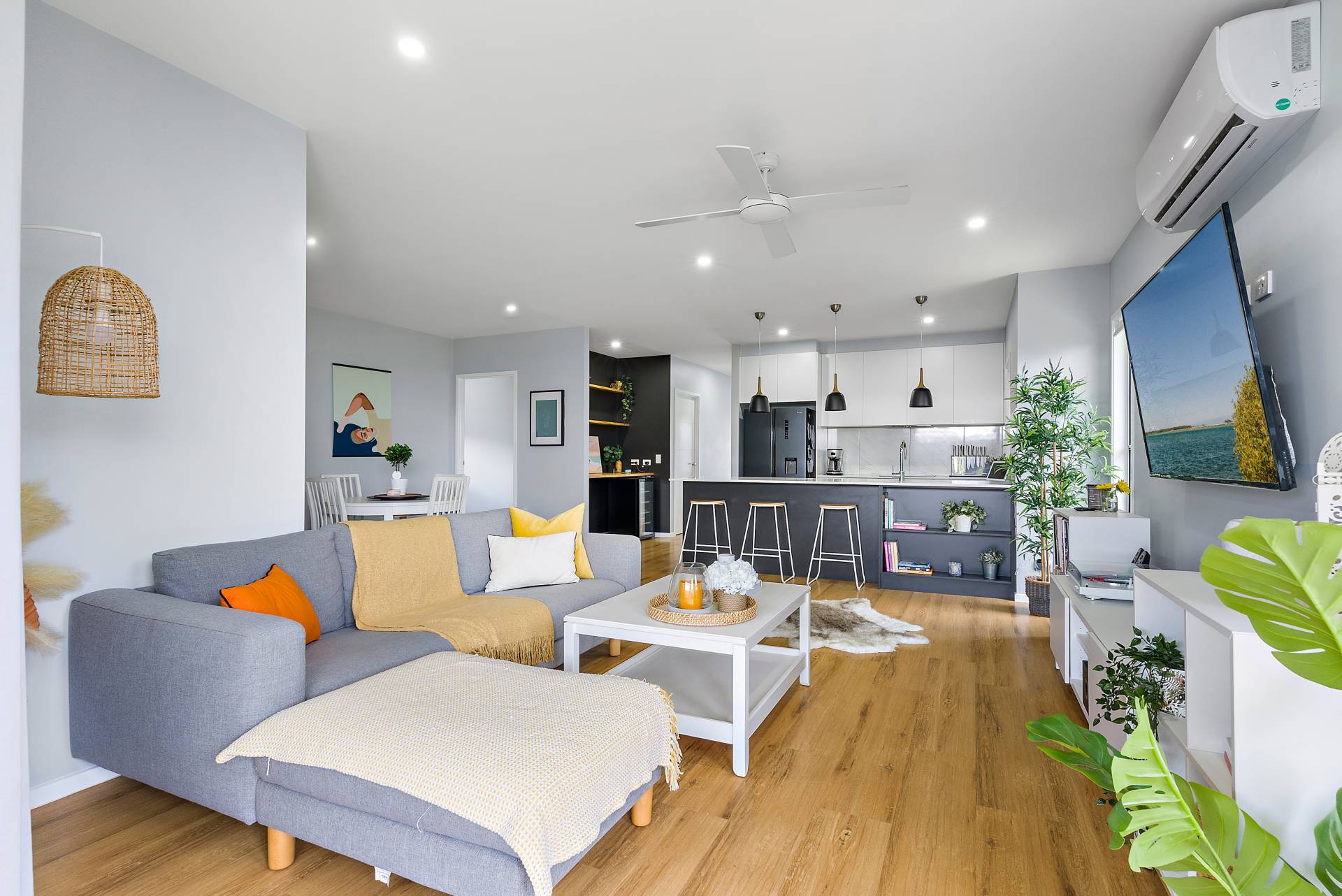 Open plan dining, lounge and kitchen with modern interiors and adjoining alfresco entertaining area