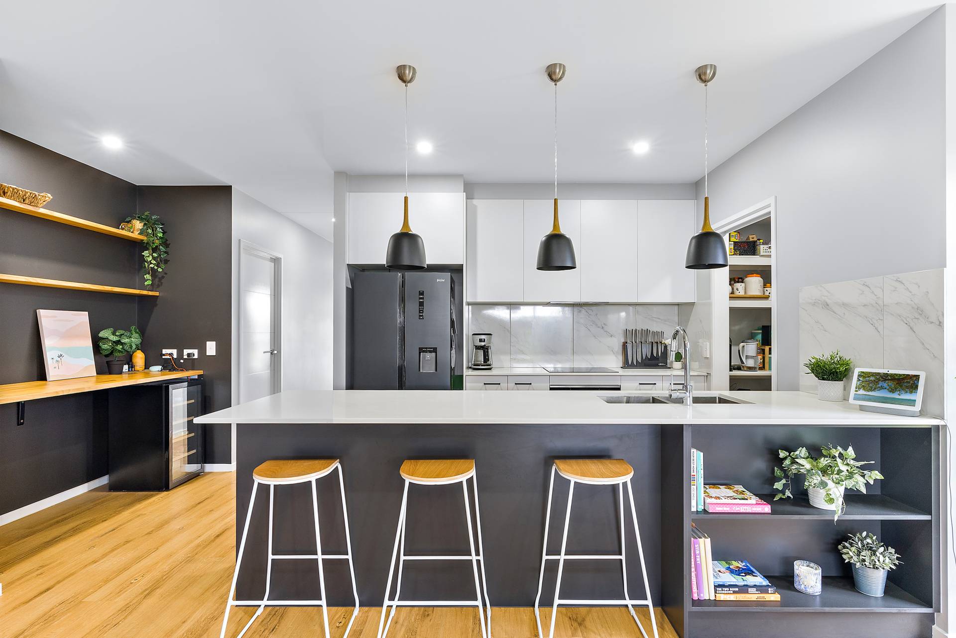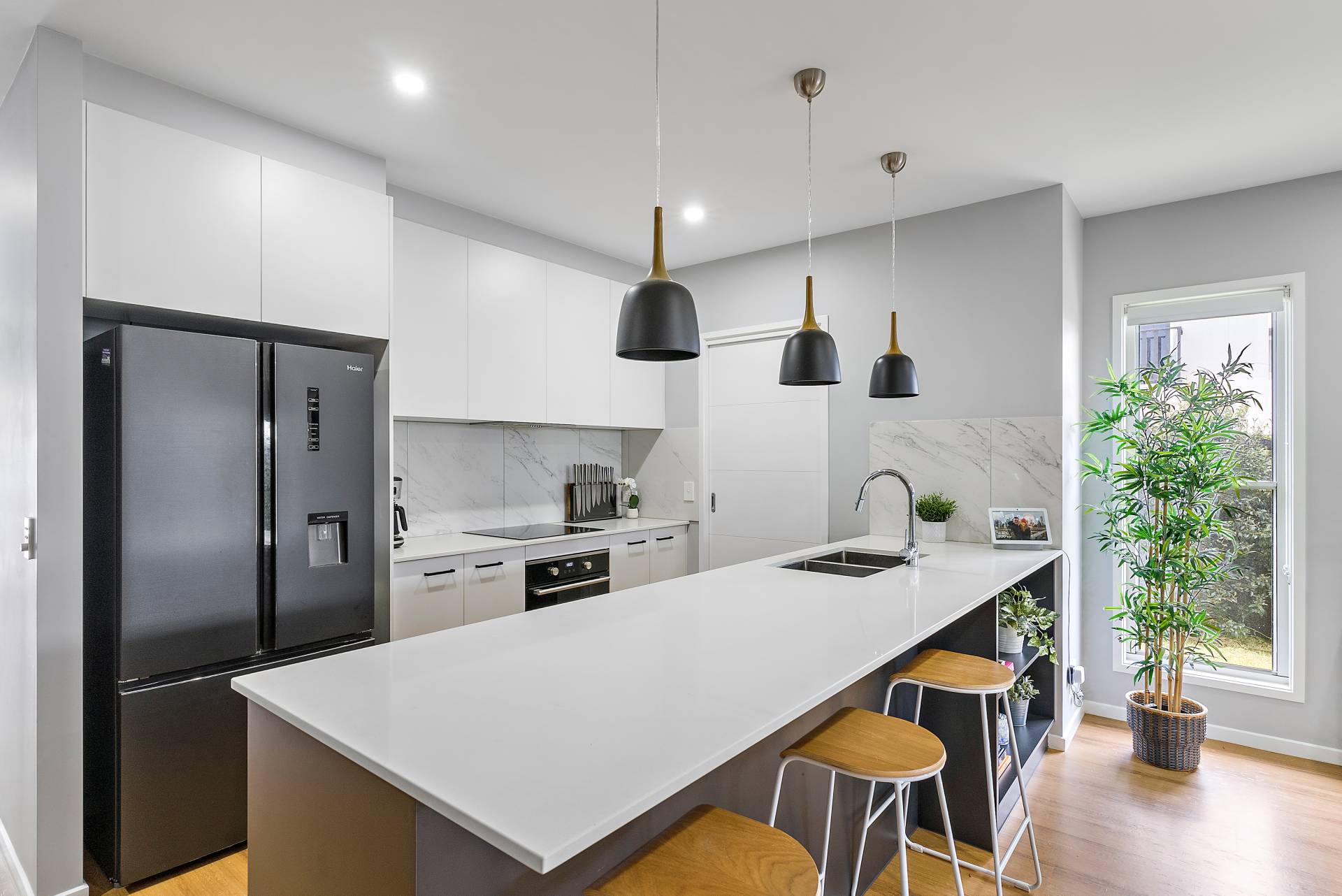 Modern kitchen boasts stone benchtops, marble tile splash-back, stainless steel appliances, recessed LED lighting and stunning smart technology pendant lighting