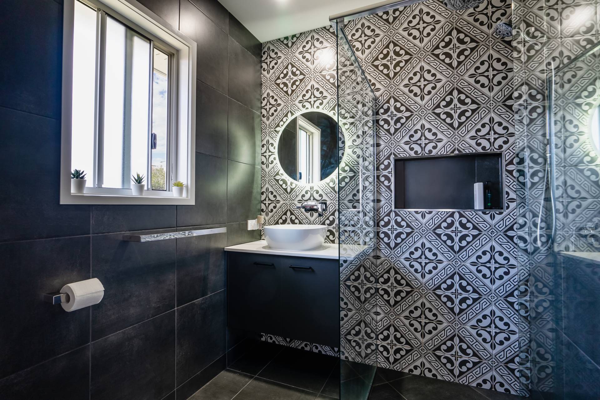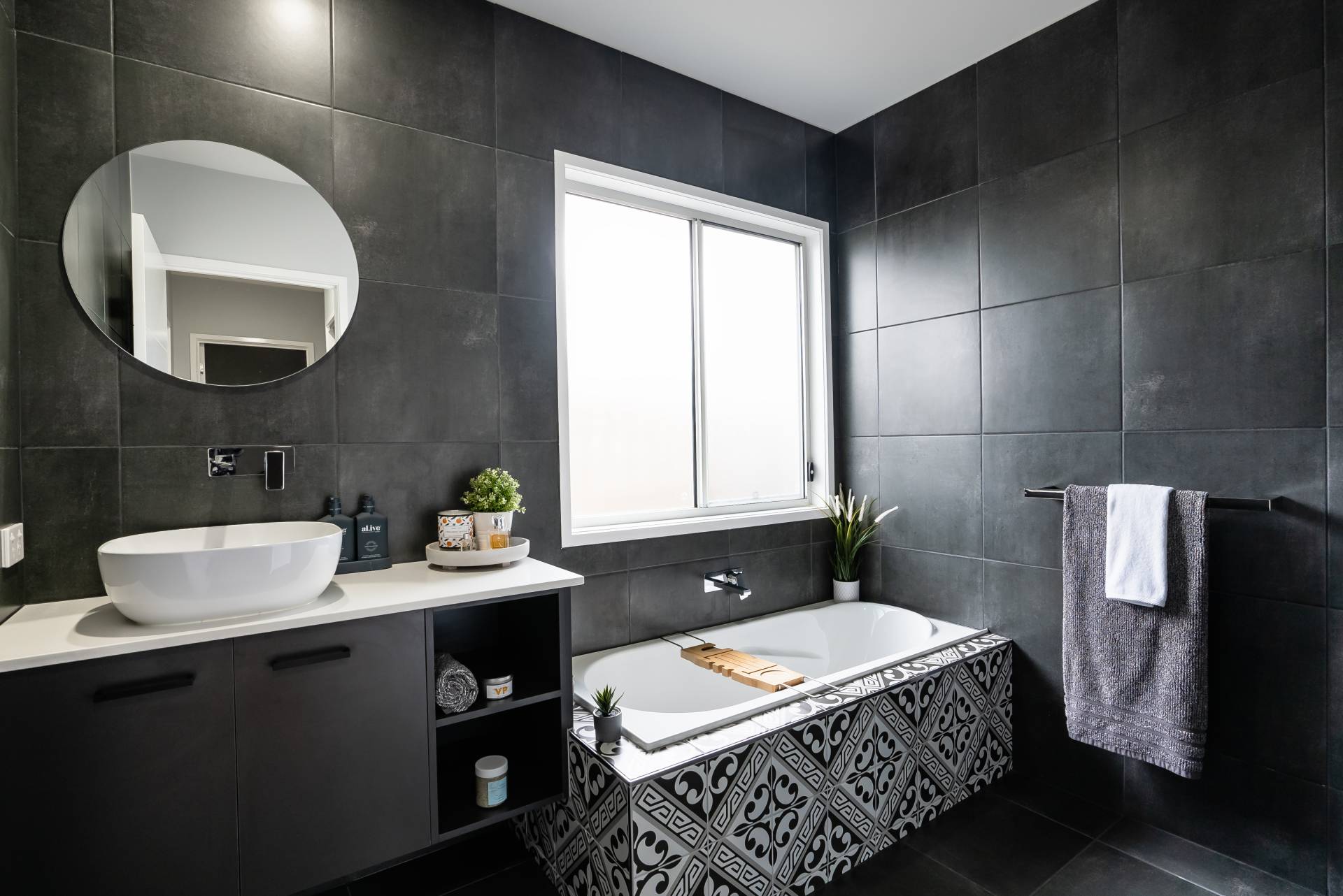 Ensuite showcases a stone-top vanity, feature mirror with inbuilt LED lighting, shower with tiled feature wall, niche and floor-to-ceiling premium tiles