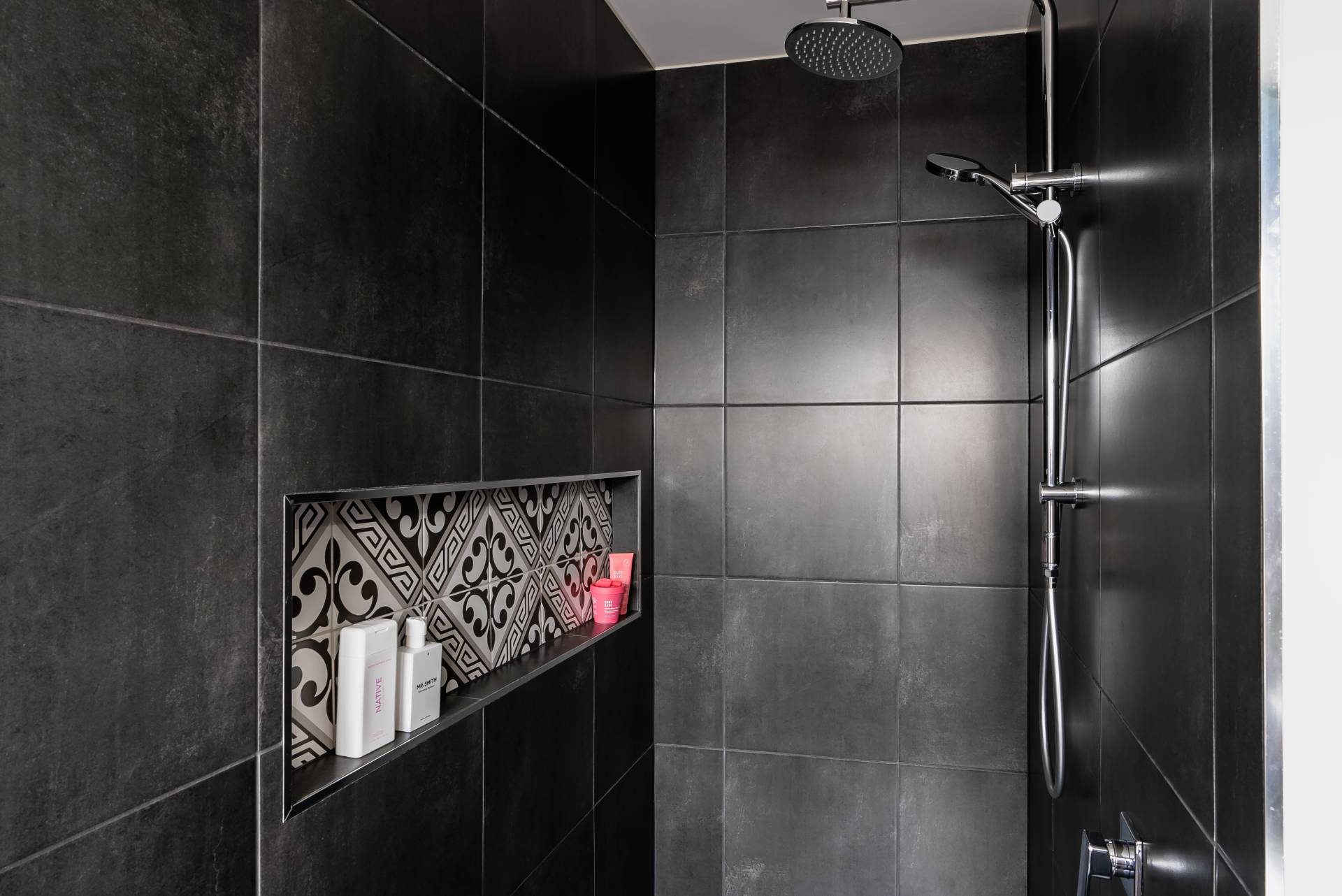 Large main bathroom with bathtub, shower with rainfall and adjustable shower head and niche, floor-to-ceiling tiles with feature tile in shower niche