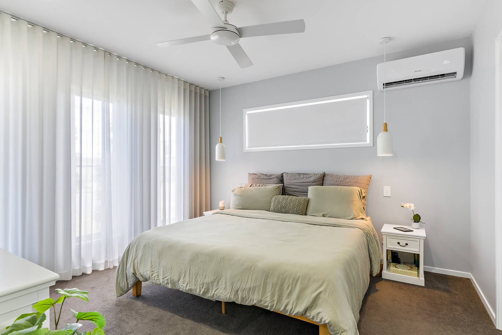 Master bedroom with smart technology bedside pendant lighting, tall windows with louvers, block and sheer floor-to-ceiling curtains, a spacious walk-in wardrobe and luxurious ensuite