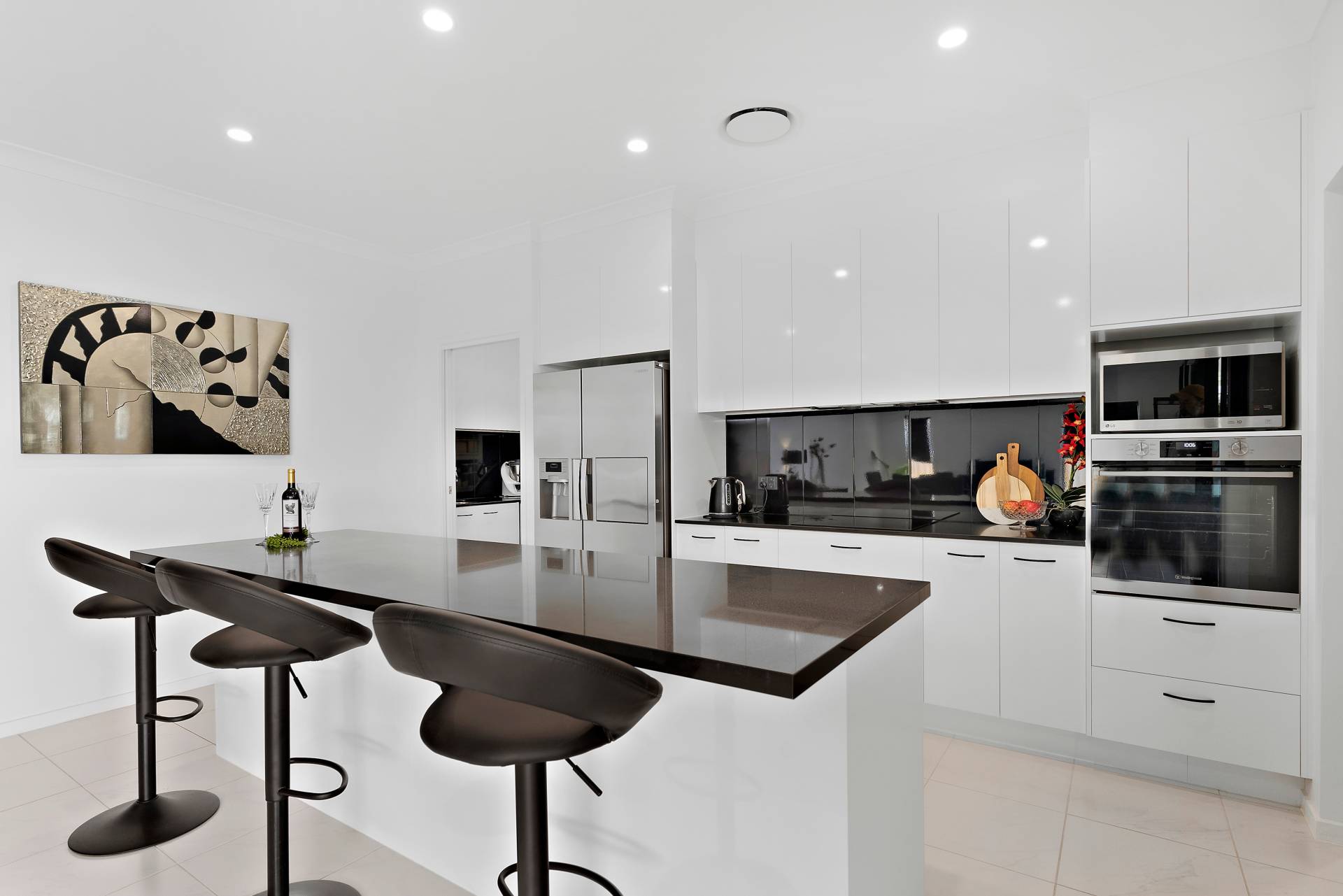 Stunning kitchen with island bench, reconstituted stone bench-tops, quality appliances and walk-in pantry