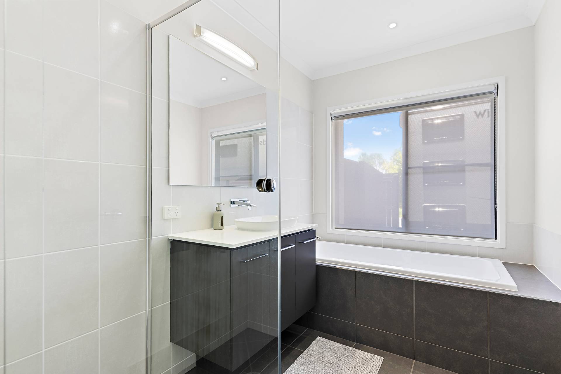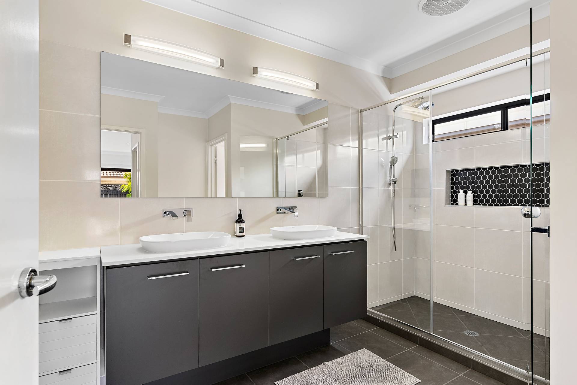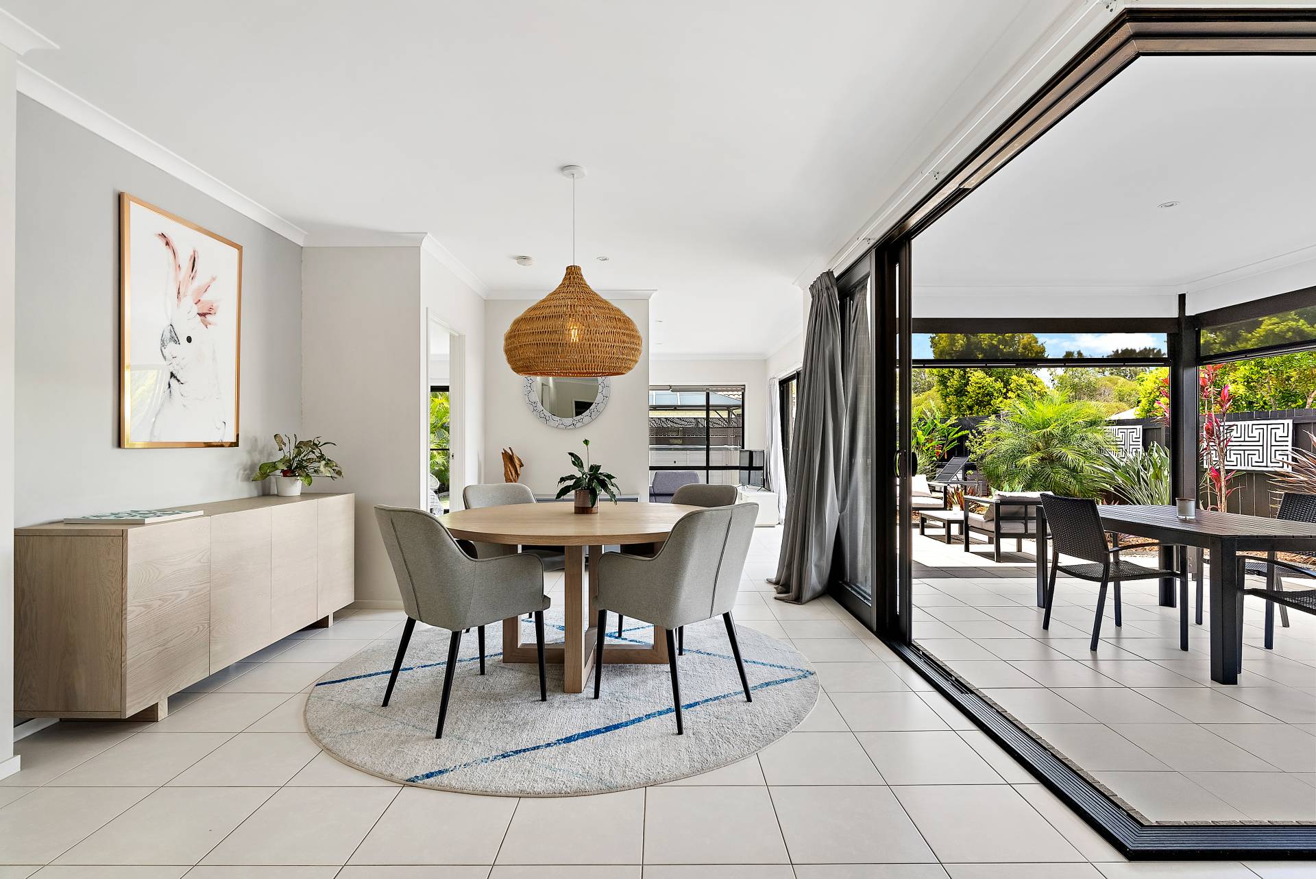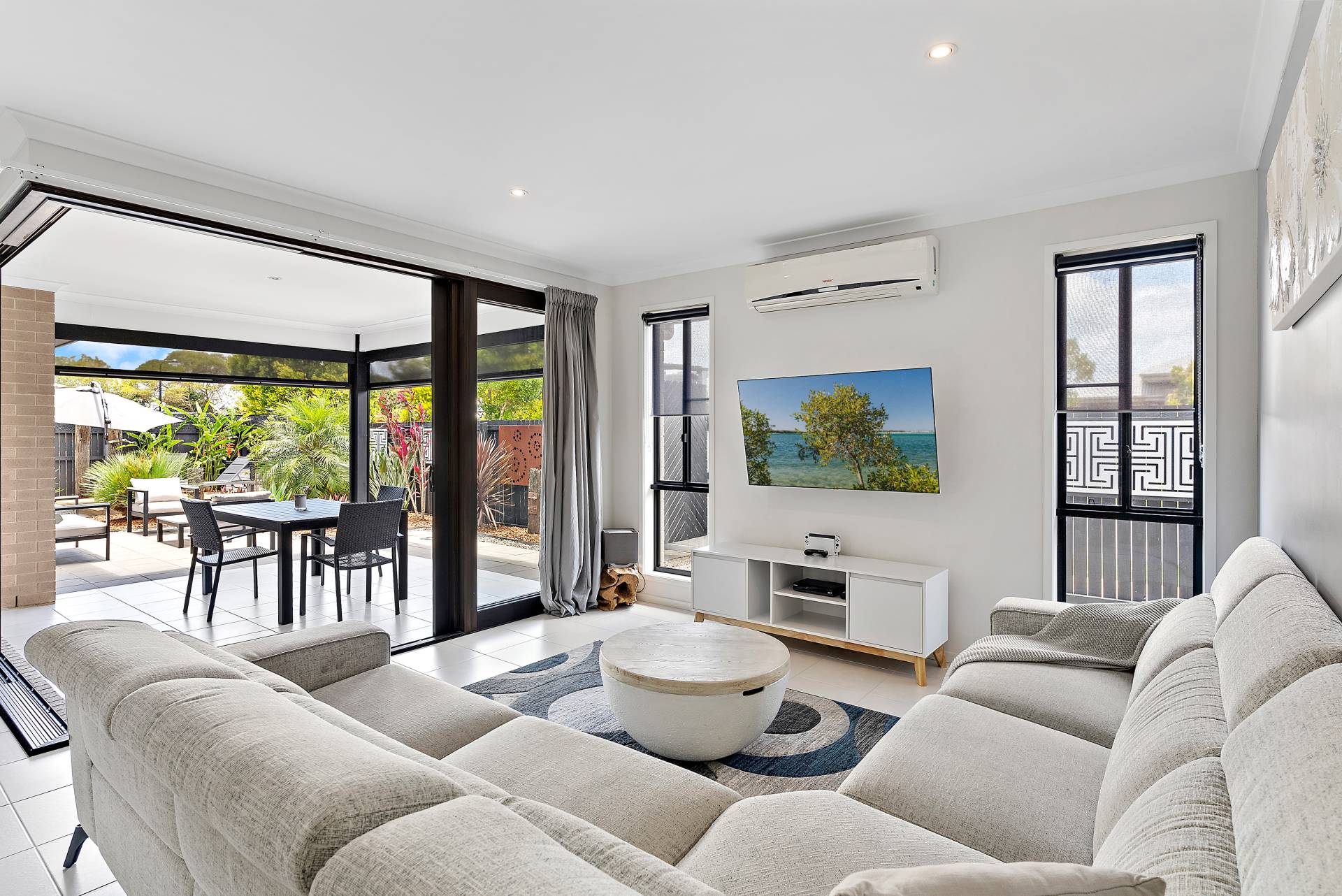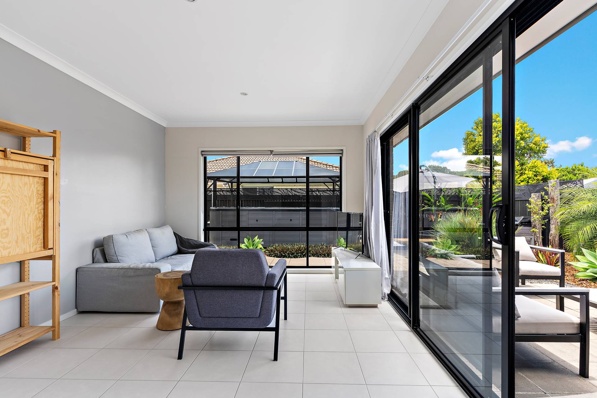The modern kitchen boasts reconstituted stone benchtops with modern appliances, walk-in pantry and kitchen island, framed by contemporary pendant lighting. Extending the indoors to outdoor entertaining the lounge and dining meet with corner glass stacker doors opening onto the screened, covered alfresco. This is the perfect place to entertain and relax looking out onto the landscaped, low maintenance patio garden. Complete with established plants, sundeck and covered spa, this stunning home has it all.