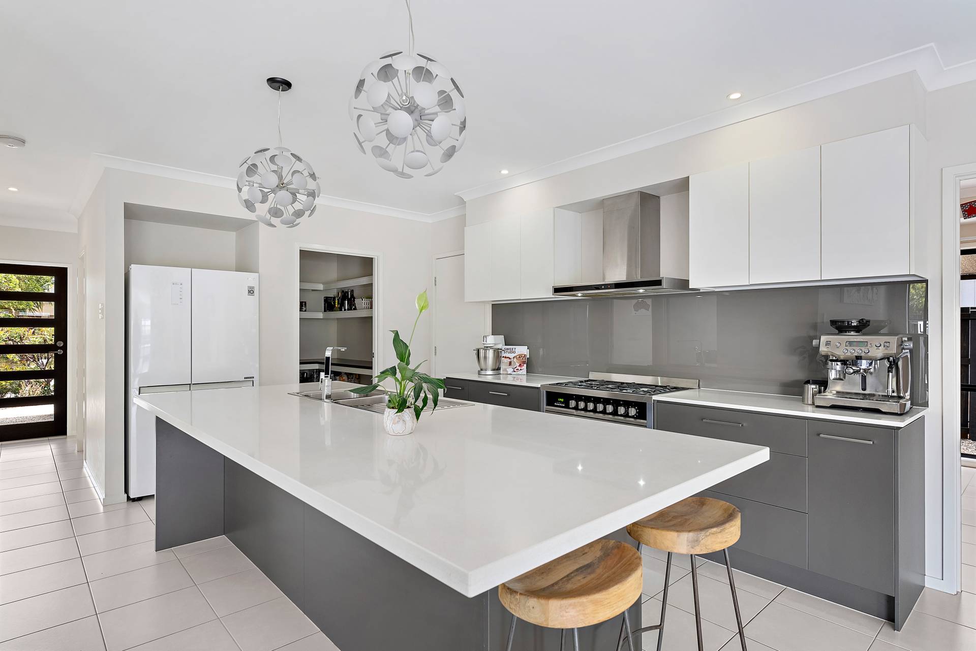 Modern kitchen with reconstituted stone benchtops, quality appliances, ample storage and large kitchen island with pendant lighting