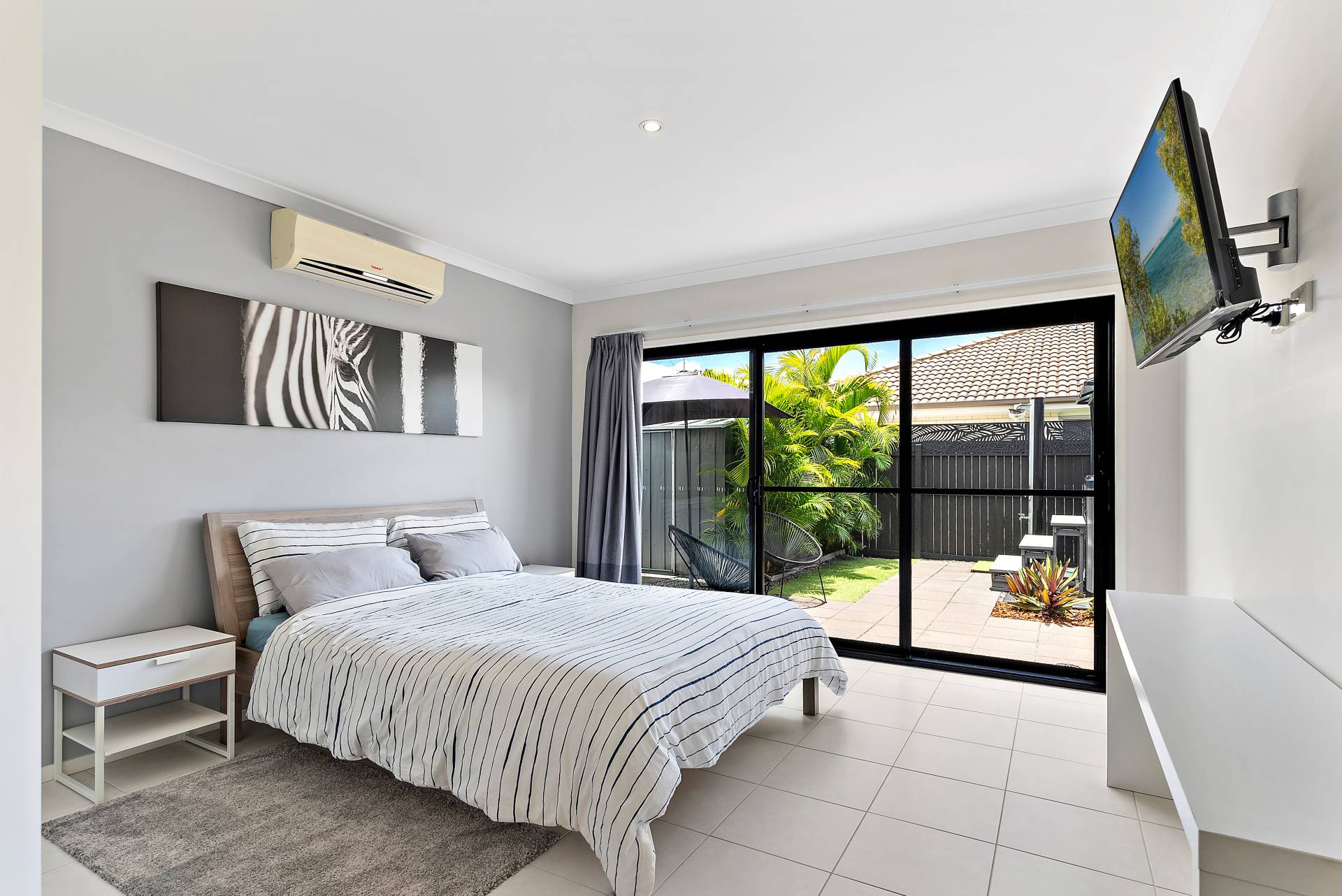 Master suite with double vanity ensuite, walk-in robe and glass stacker doors opening onto the paved patio and spa