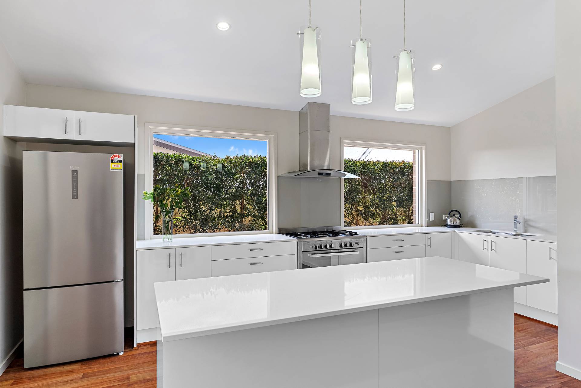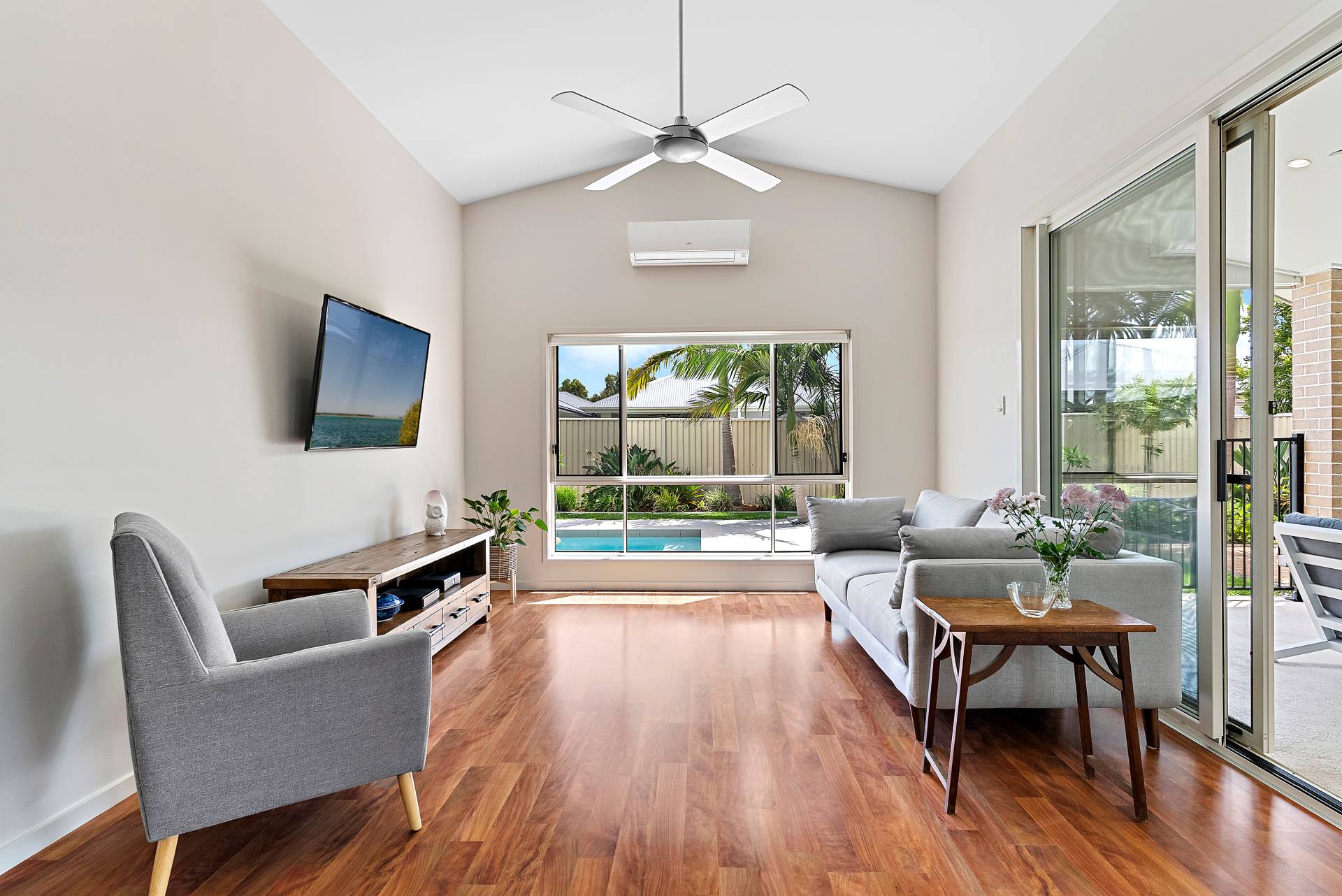 Boasting a spacious open plan kitchen, living and dining, the heart of the home is enveloped with light and natural breezeways. Wrapped in large windows and corner meeting glass stacker doors, the abundance of light emphases the remarkable roof lines and picks up the beautiful texture of the hardwood flooring. With magnificent flow through to the outdoors, the interior offers picturesque views of greenery and the sumptuous sparkling pool. For the chef the home, the centrally located kitchen enables you to both cook and entertain. The modern kitchen benefits from reconstituted stone benchtops, quality appliances, ample cupboard space, walk-in pantry and a large kitchen island with pendant lighting. Meticulously crafted with family in mind, 74 Indigo Road seamlessly combines indoor/outdoor living that boasts privacy and tranquillity. Be it entertaining under the covered alfresco, relaxing by the fire-pit or swimming in the magnificent pool, there is something for everyone.