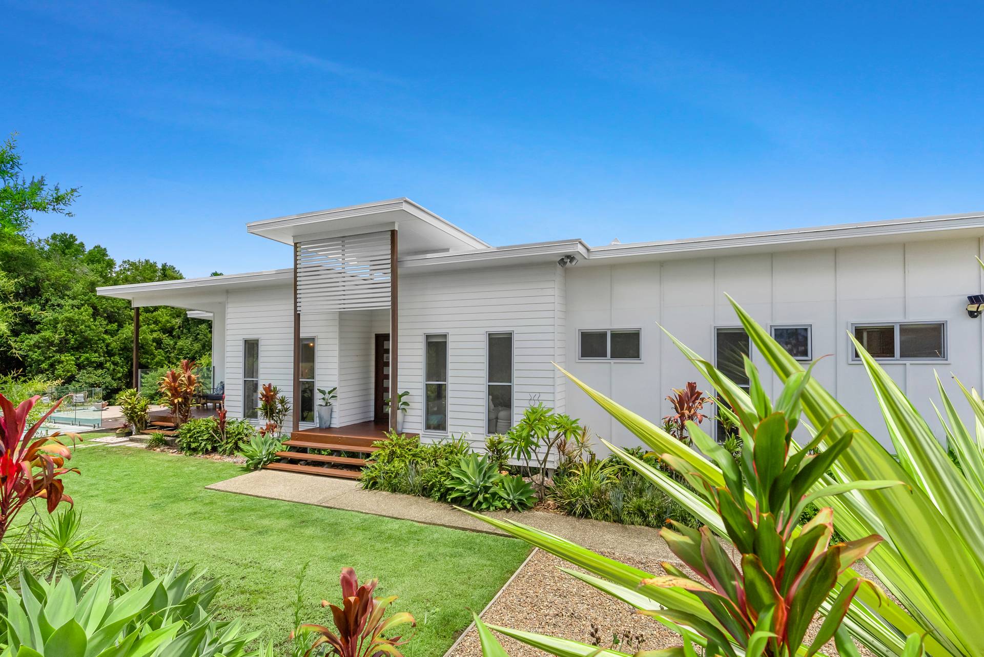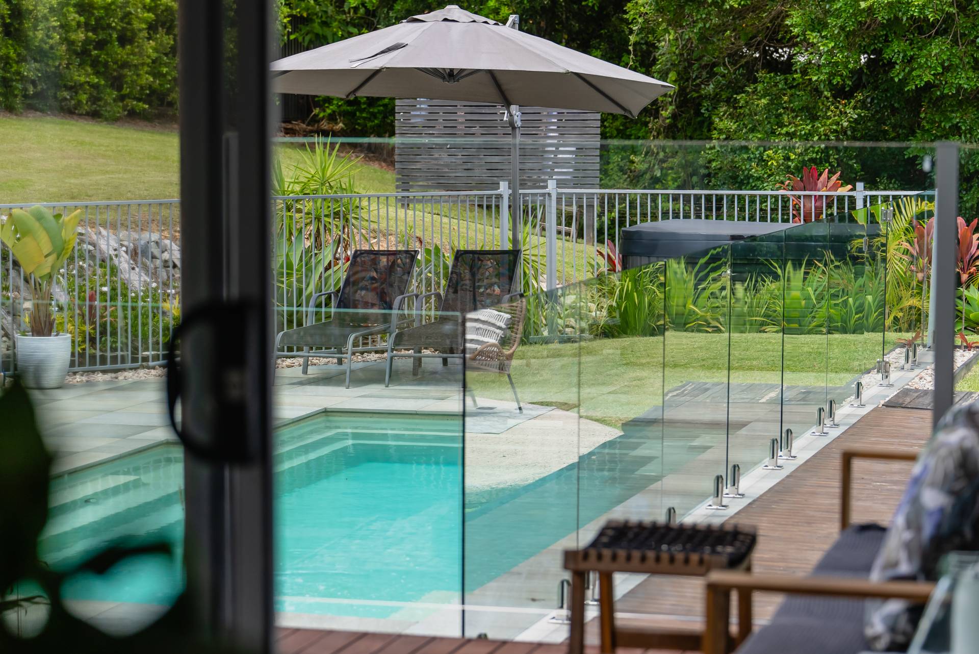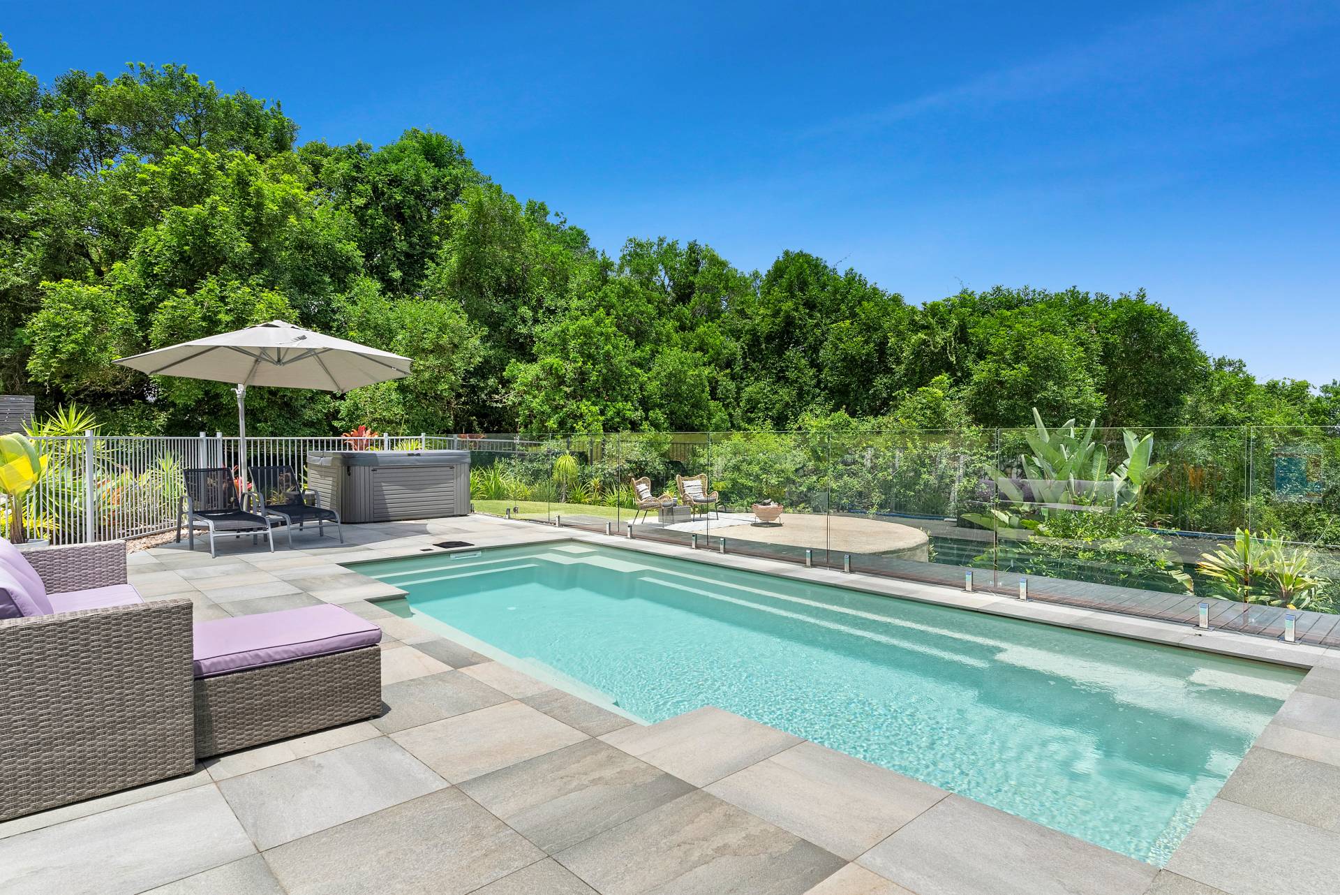 Outside, the level, lawned front garden leads through to the pool and hot tub spa - another inviting space to linger and enjoy the spectacular surrounds.