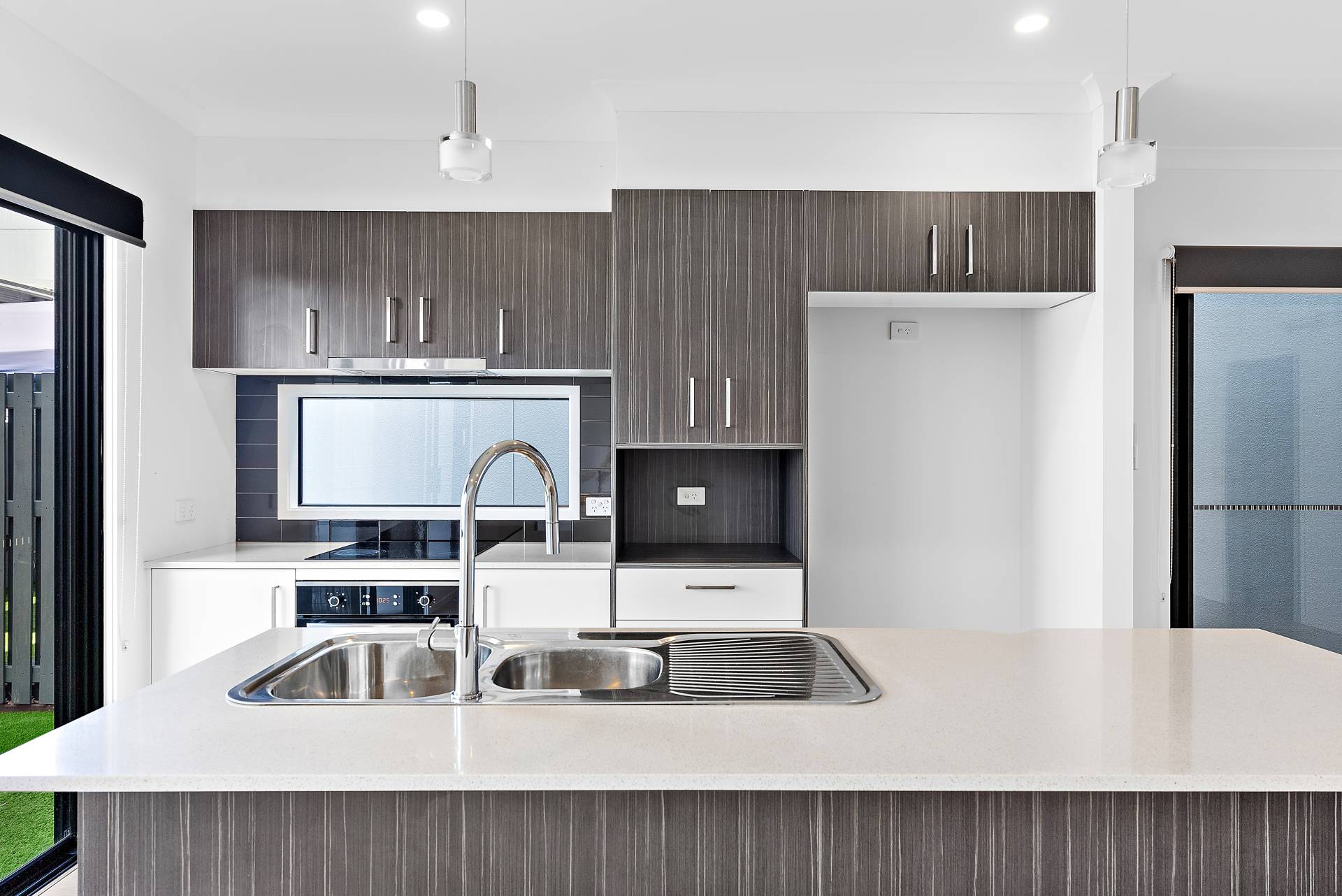 Modern kitchen with quality appliances, fridge plumbing, breakfast island and pendant lighting.
