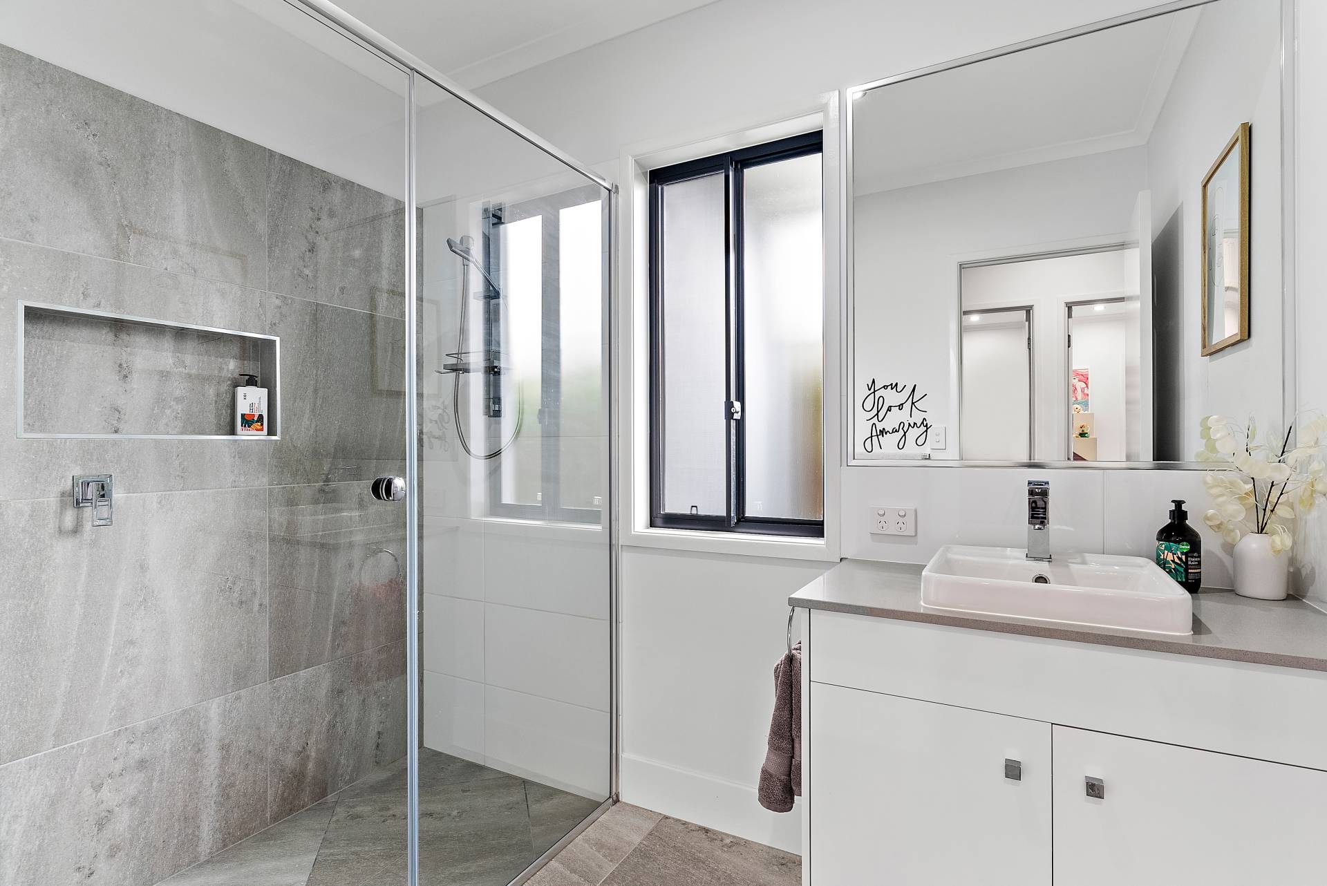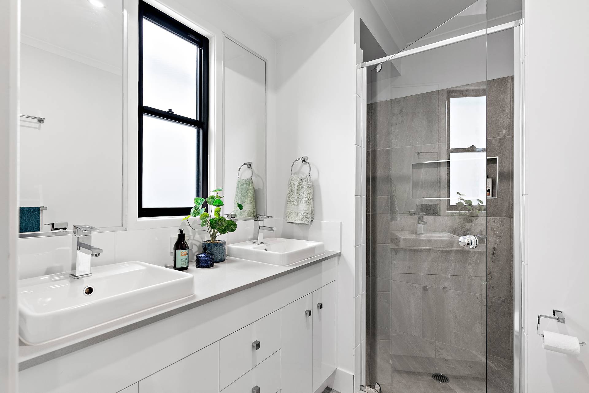 Ensuite bathroom with double vanity, spacious shower with niche and natural light