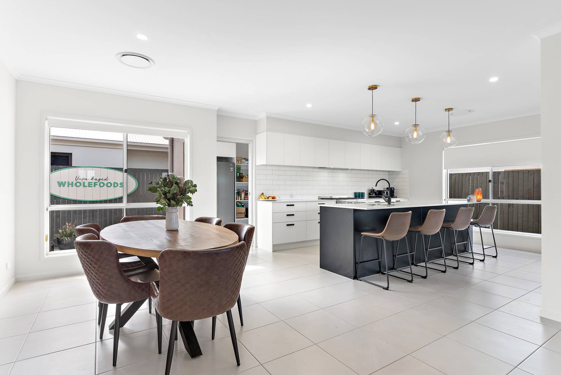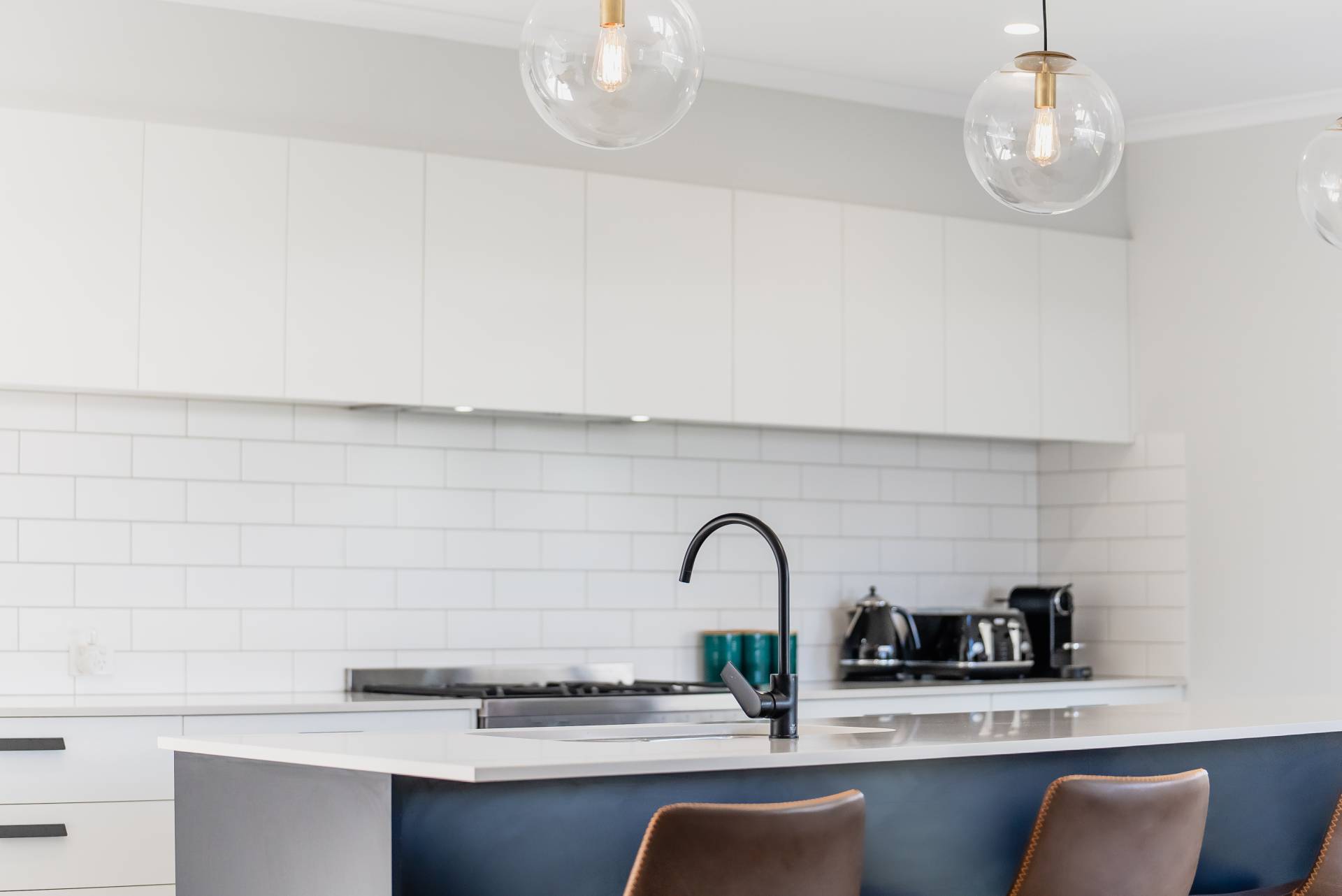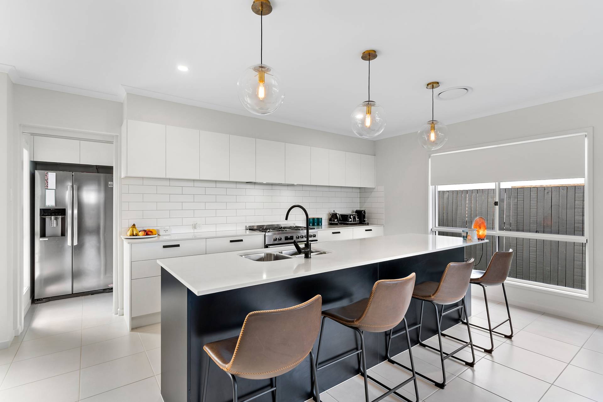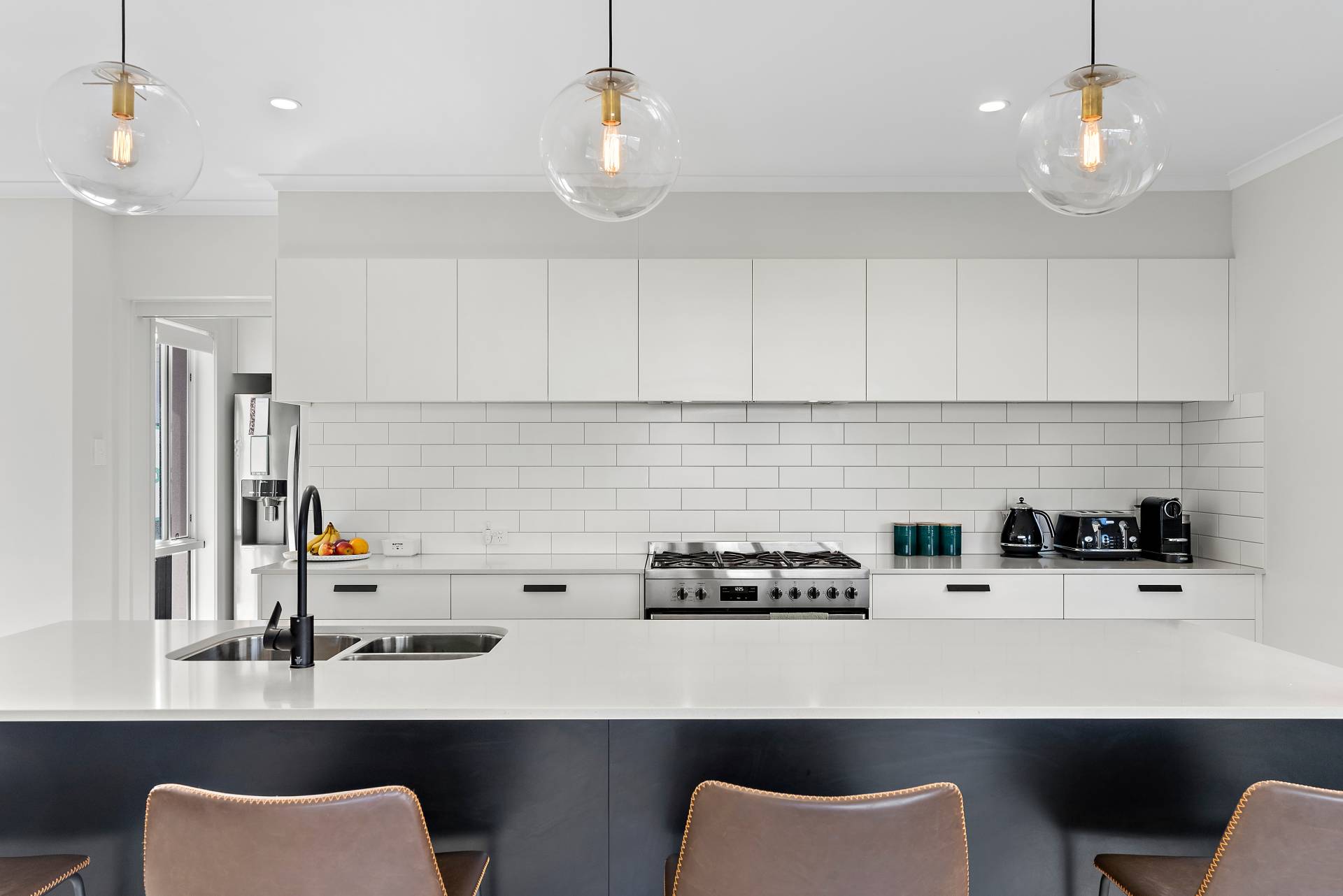 - Modern kitchen with stainless-steel appliances, subway tile splash-back, reconstituted stone bench-tops, breakfast bar with in-built sink and black tap-ware, framed by opulent pendant lighting.