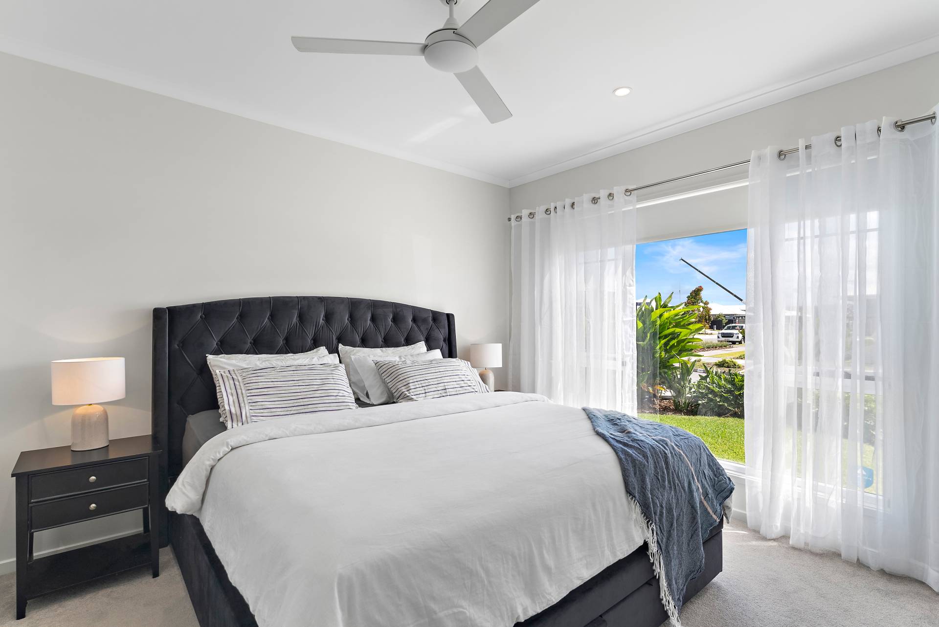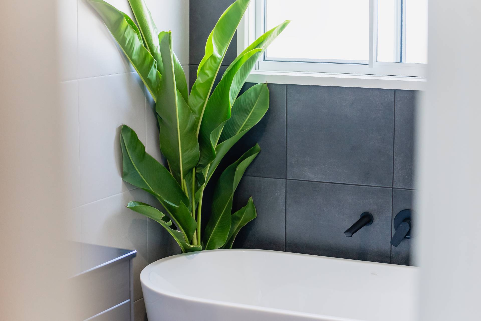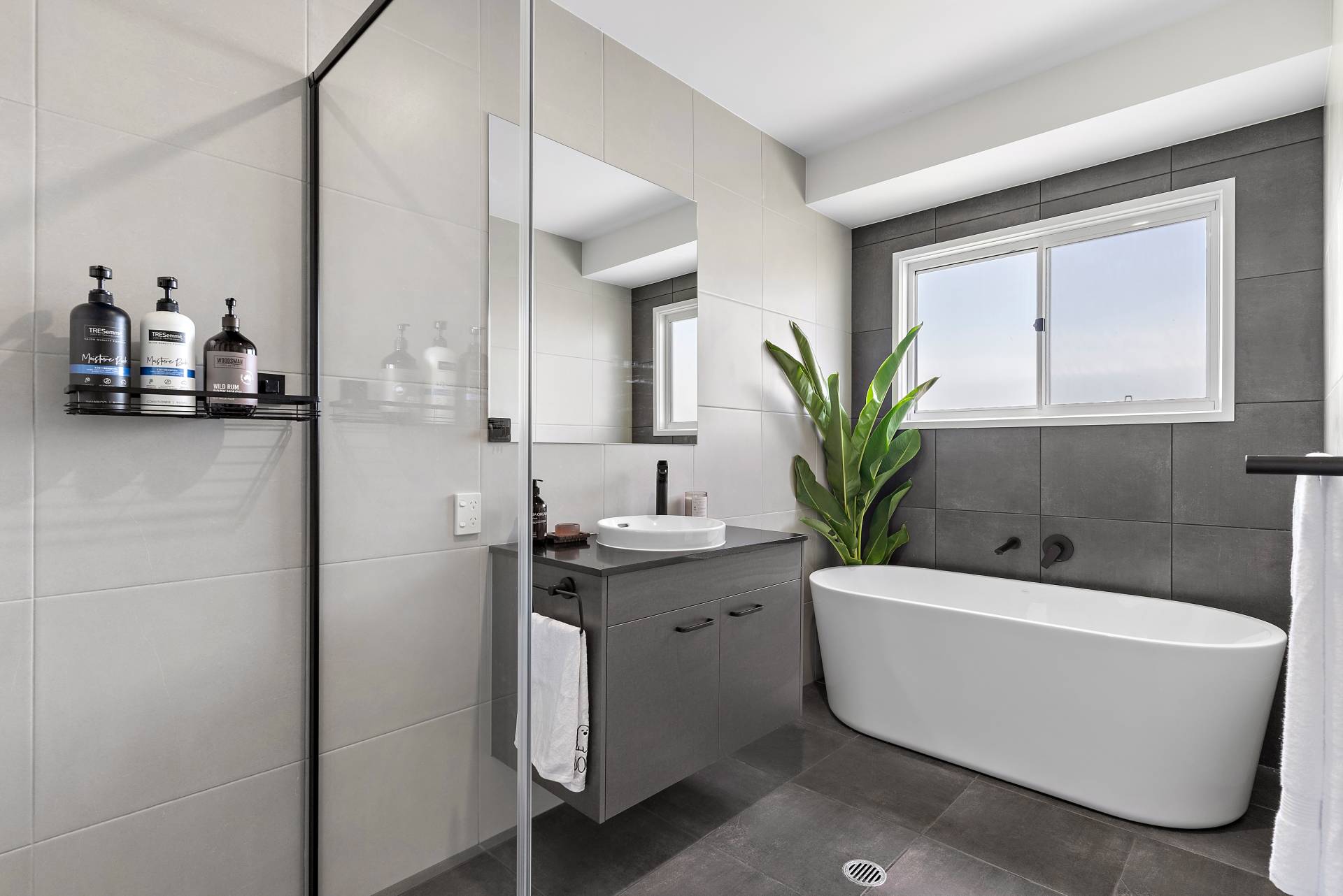 - Both bathrooms with floor-to-ceiling tiles and black tap-ware