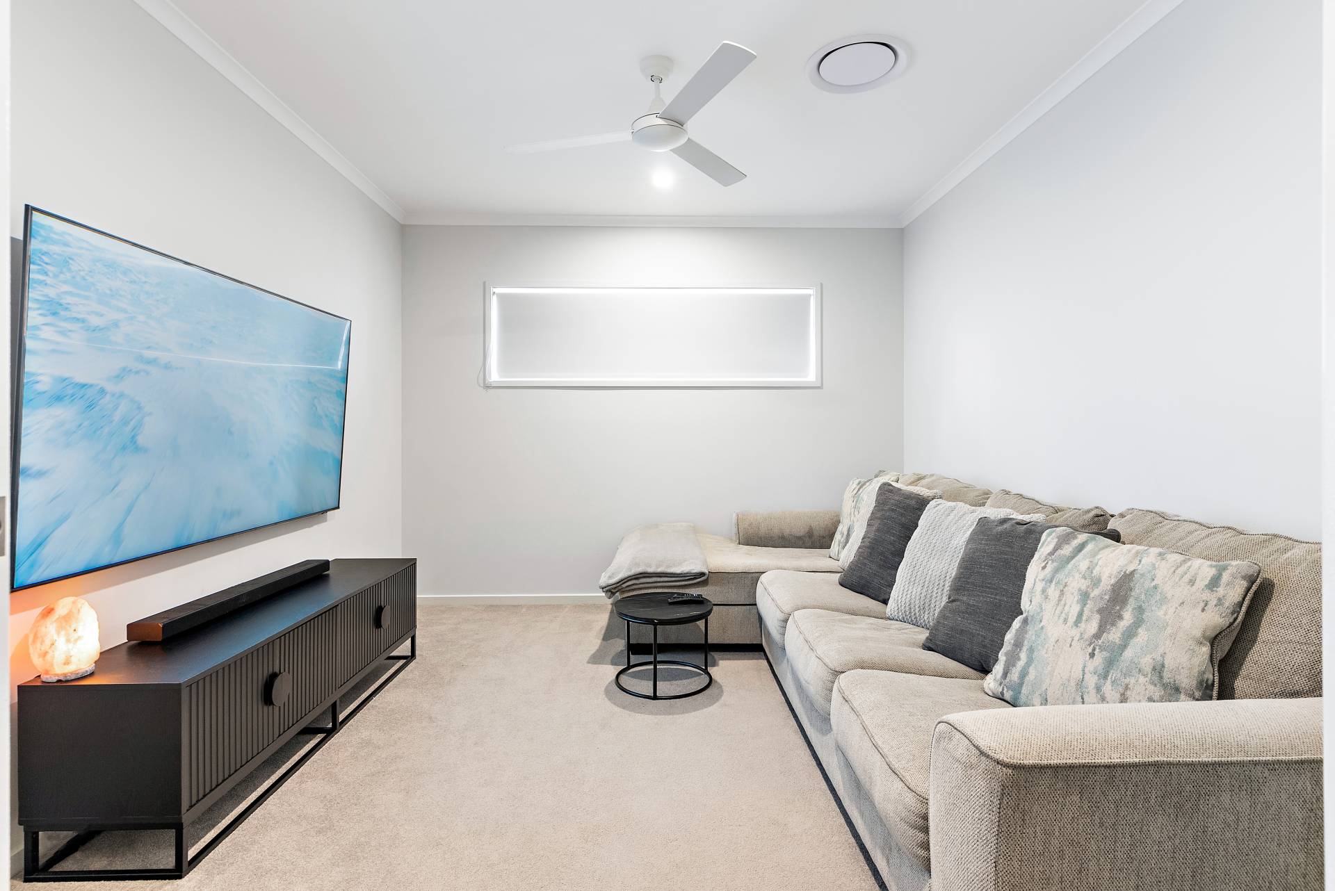 - Media room with pocket doors and blinds