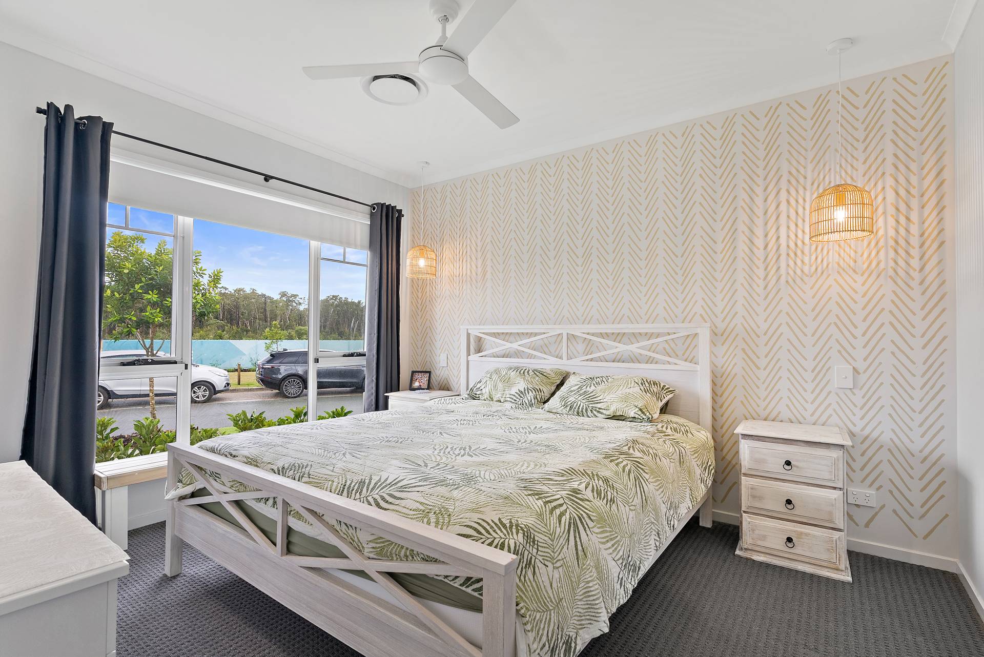 Master bedroom with feature wall, bedside pendant lighting, ensuite and walk-in robe