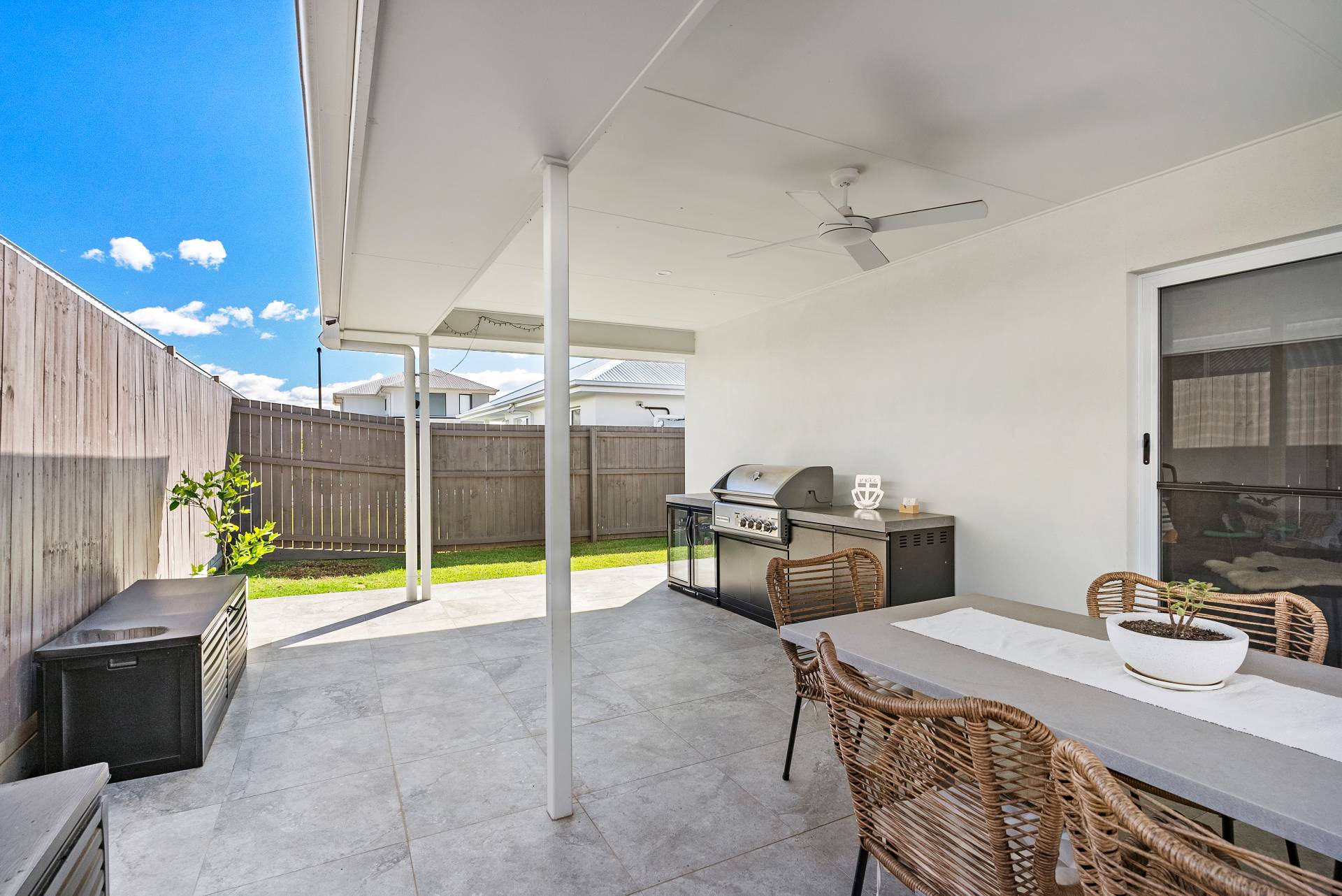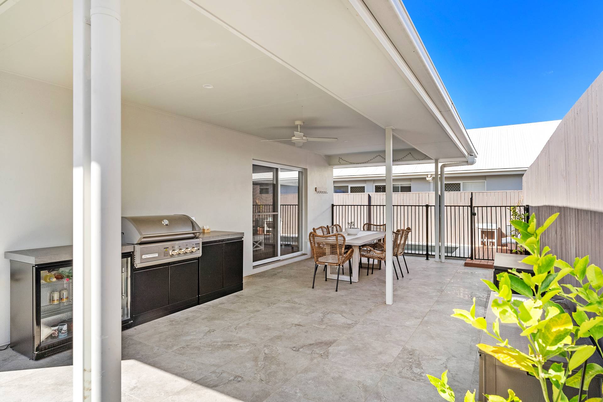 Large covered outdoor entertaining space with stone effect tiles