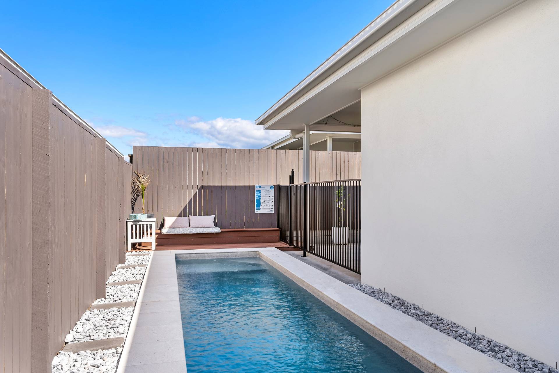 Swimming pool wh bench seat overlooking the water