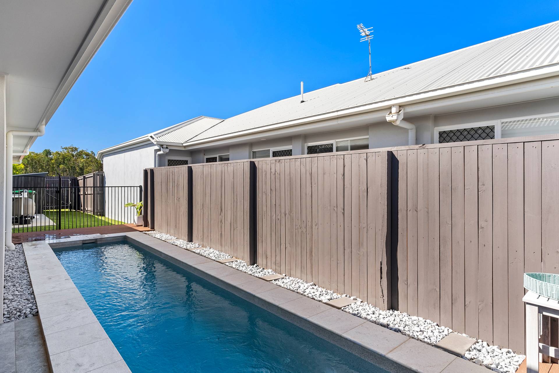Fenced Outdoor entertainment area in-Ground Pool Water Tank Grey Water System