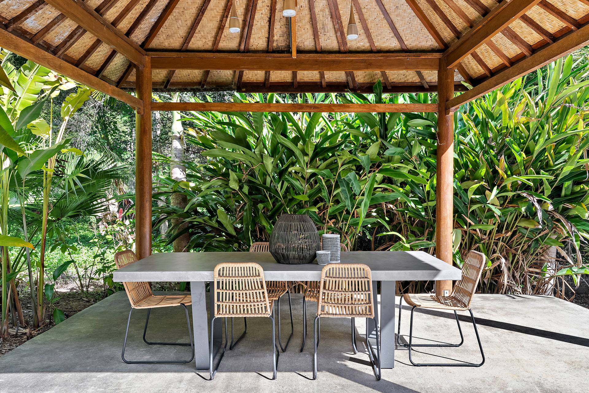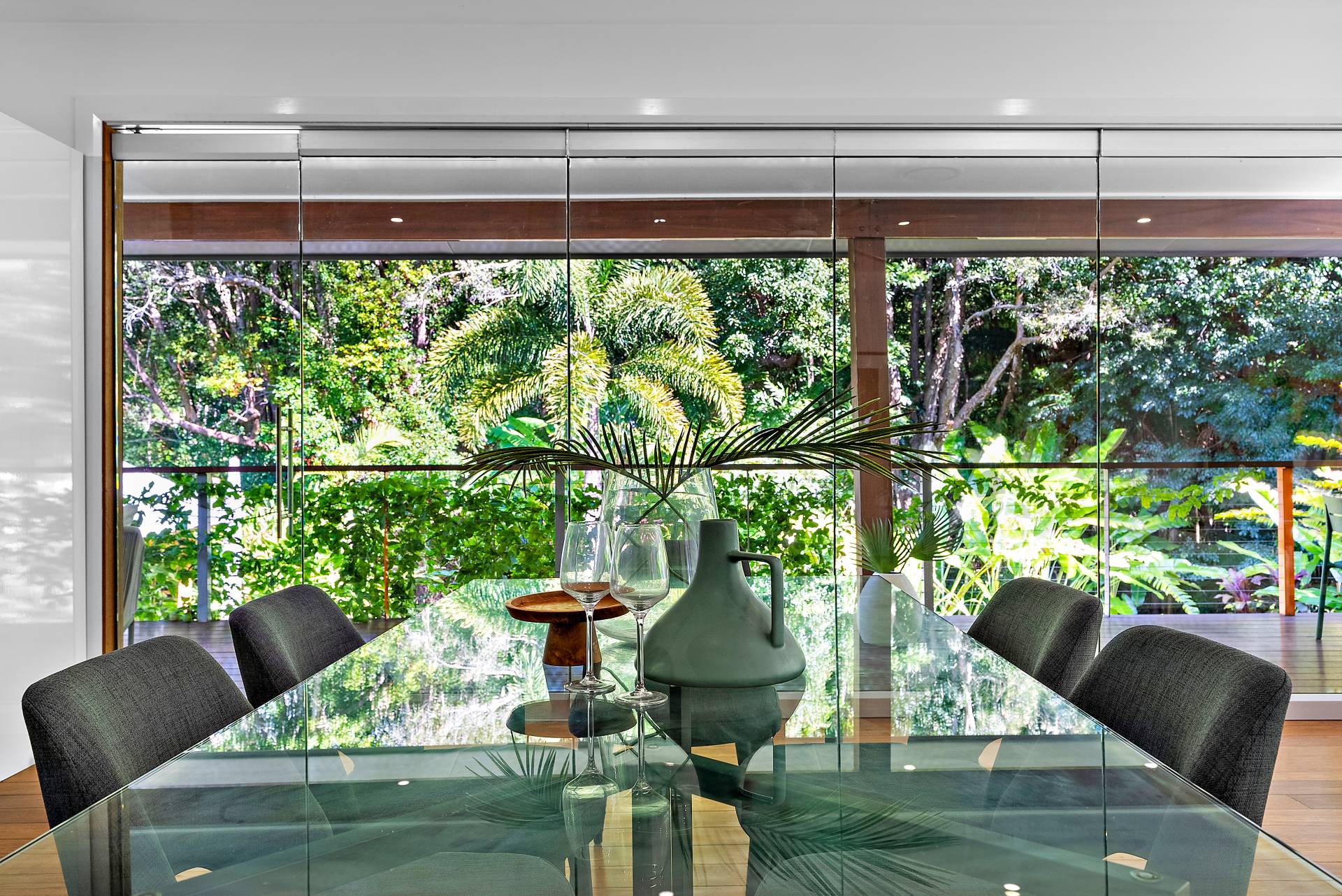 The lush tropical outlook is framed through floor-to-ceiling glass doors on two sides, creating a sense of peace and wellbeing.