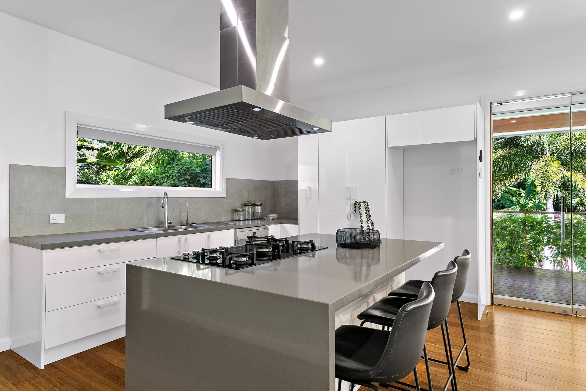 - Contemporary kitchen with Caesarstone benchtops, Bosch and Fisher & Paykel appliances, central sit-up island, filtered water tap