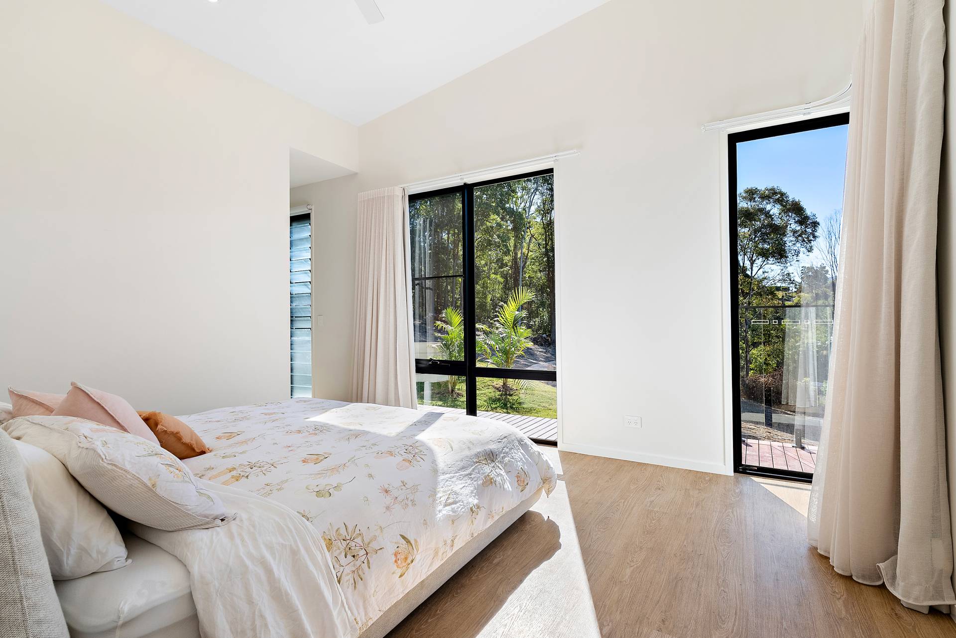 On one side of the home is a sumptuous master bedroom, again offering bush views through full-length picture windows, with a big walk-through wardrobe leading into a luxe ensuite with double sink, double rain shower and large standalone bathtub.