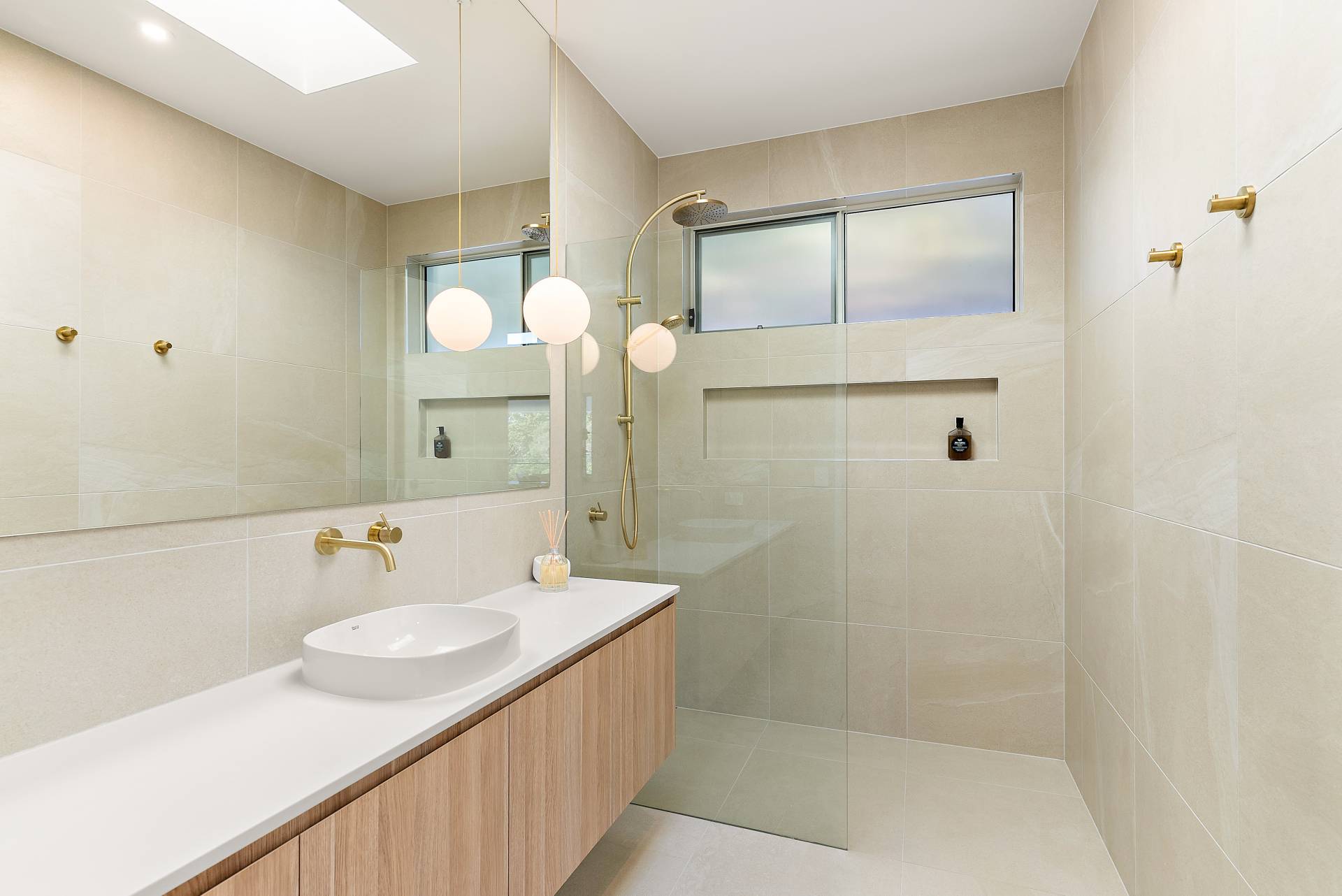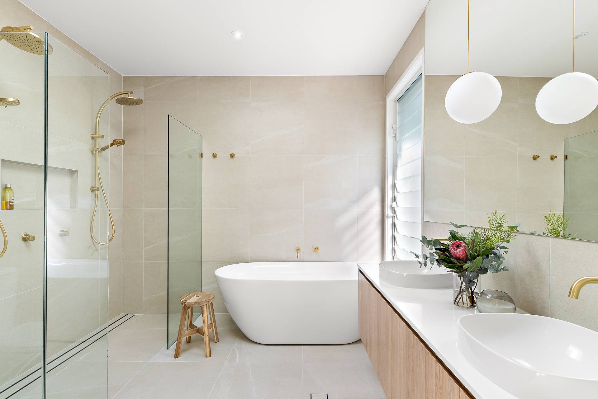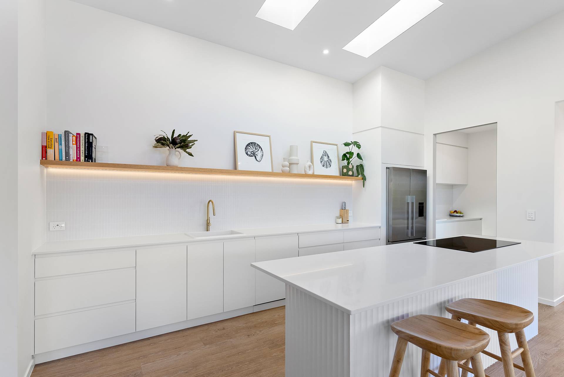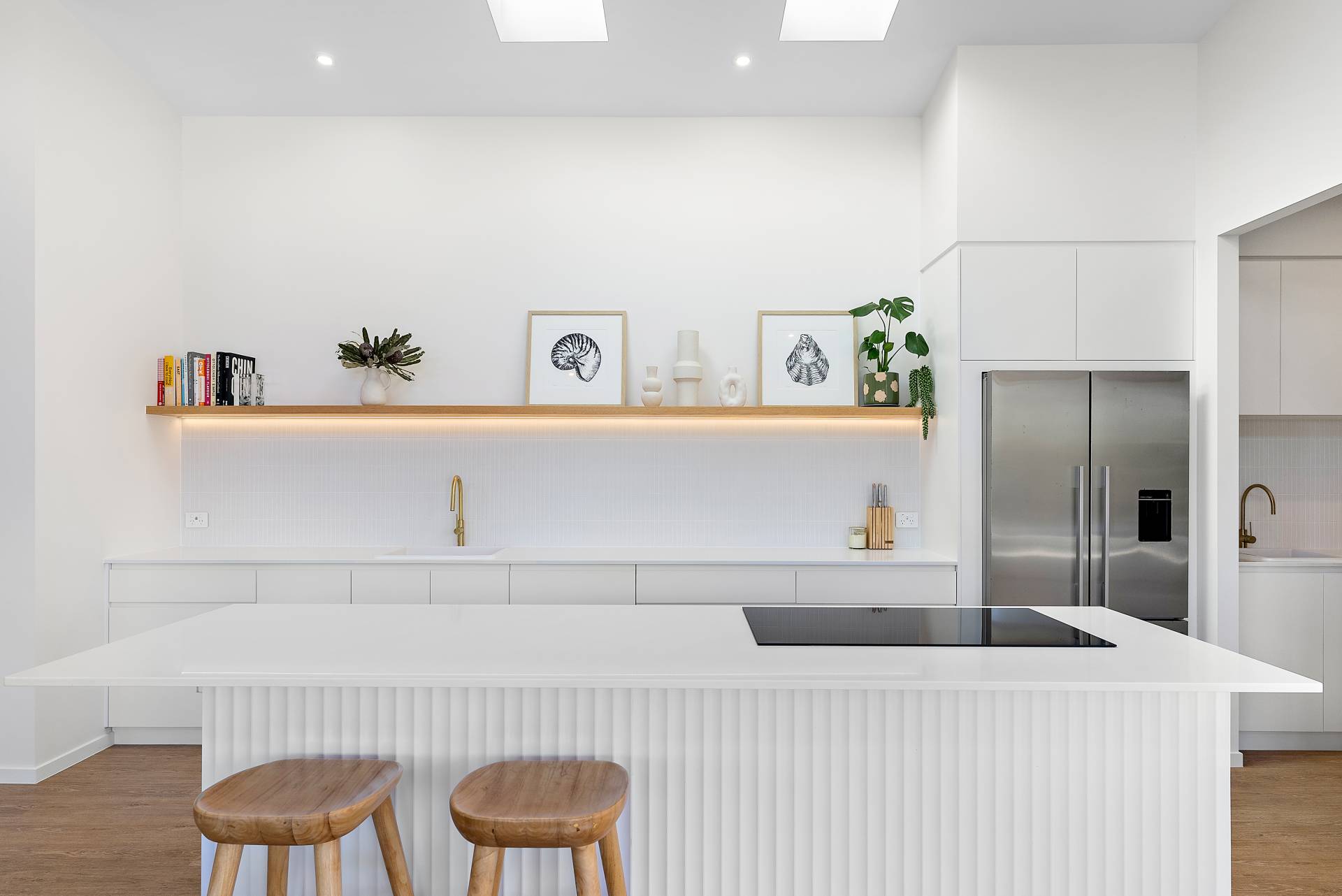 The chic contemporary kitchen includes a Tasmanian oak floating shelf with custom lighting, soft close cabinetry, plumbed fridge, Smeg integrated dishwasher and sit-up island bench with 900mm DeLonghi induction cooktop and Smeg oven. A walk-in butler's pantry with a second sink creates ample hidden storage and prep space. The Caesarstone 'snow' benchtops and Phoenix brushed gold tapware of the kitchen are replicated throughout the bathrooms and laundry, creating a strong sense of flow.