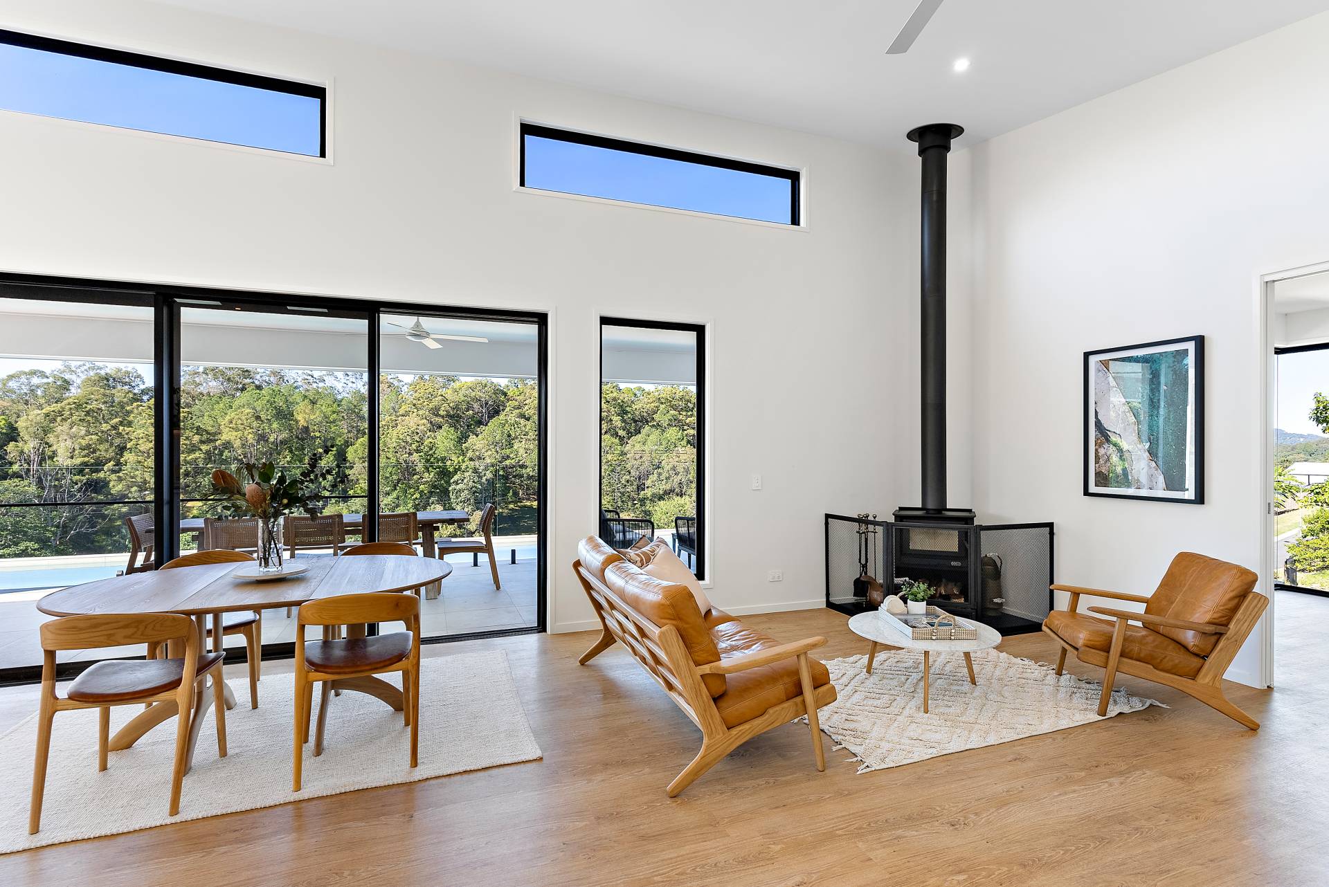 Sliding glass doors feature across the front of an expansive open-plan living and dining space at the heart of the home. A lovely corner fireplace provides a cosy focus during the brief Sunny Coast winters, while raked 4m ceilings, high-set windows and composite plank flooring create a feel of light and space, flowing out to the gorgeous terrace and pool deck beyond.