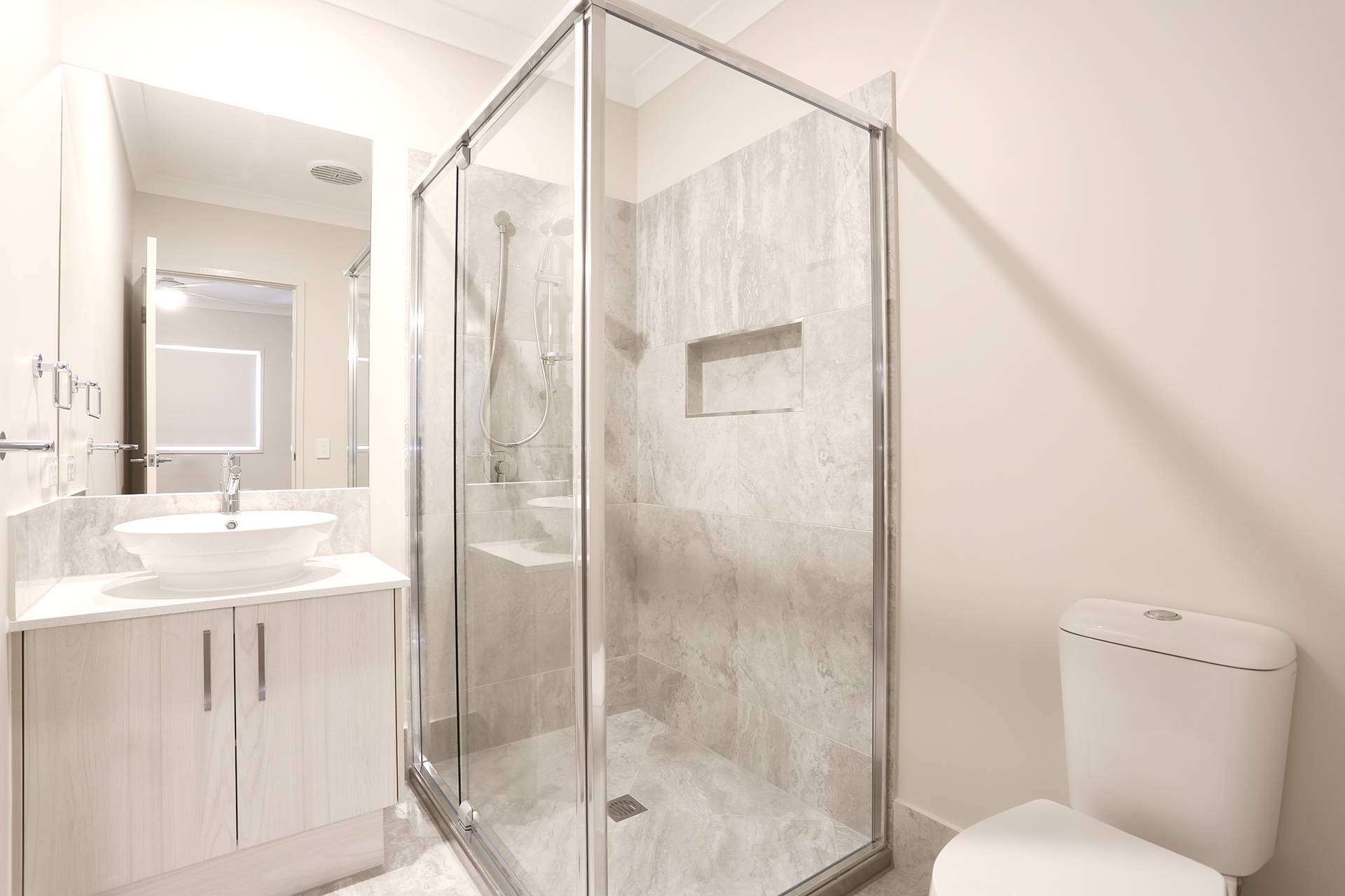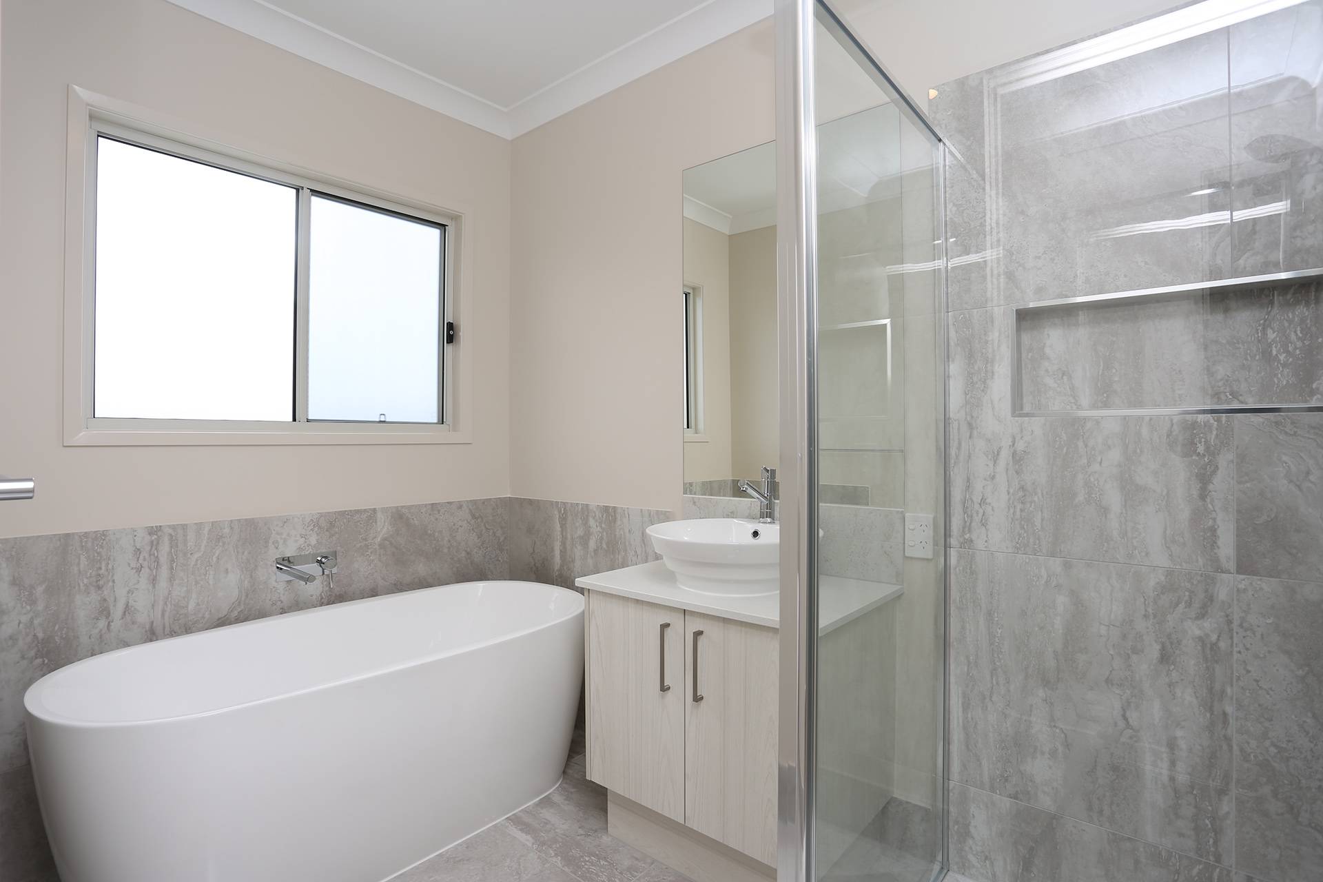 - Two well-appointed bathrooms with stone bench tops, frameless mirror, shower niche, quality tiles and free-standing tub to main bathroom