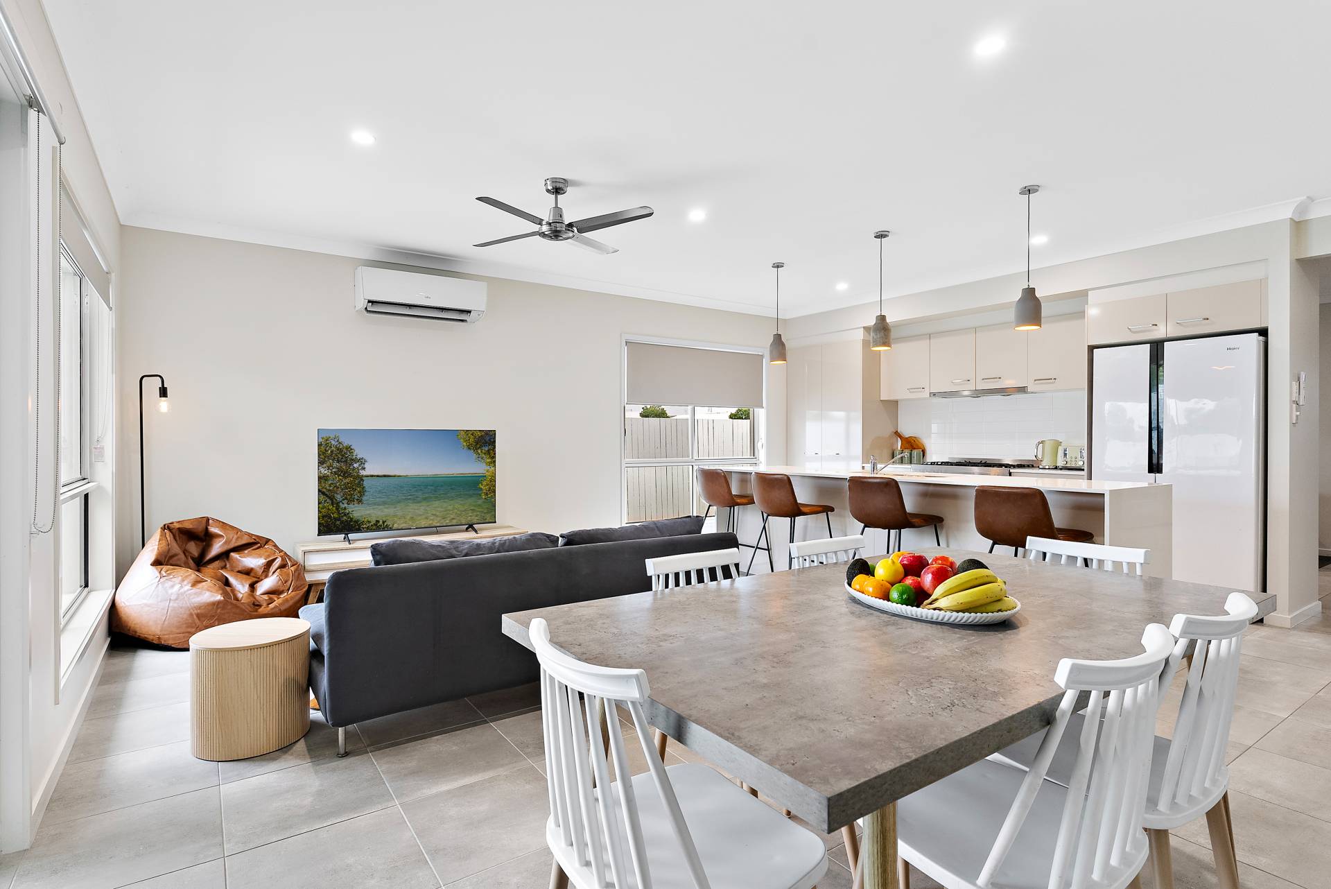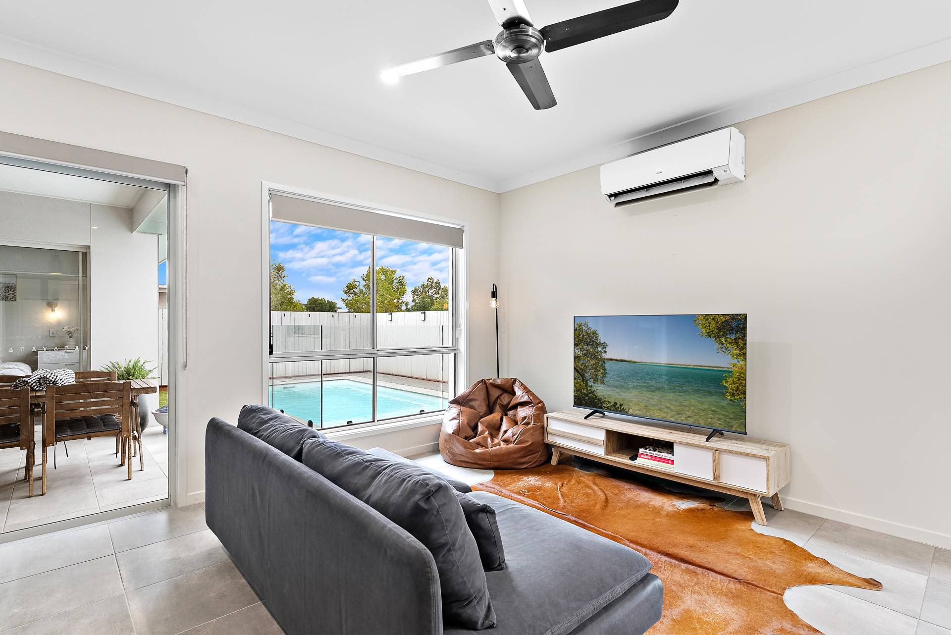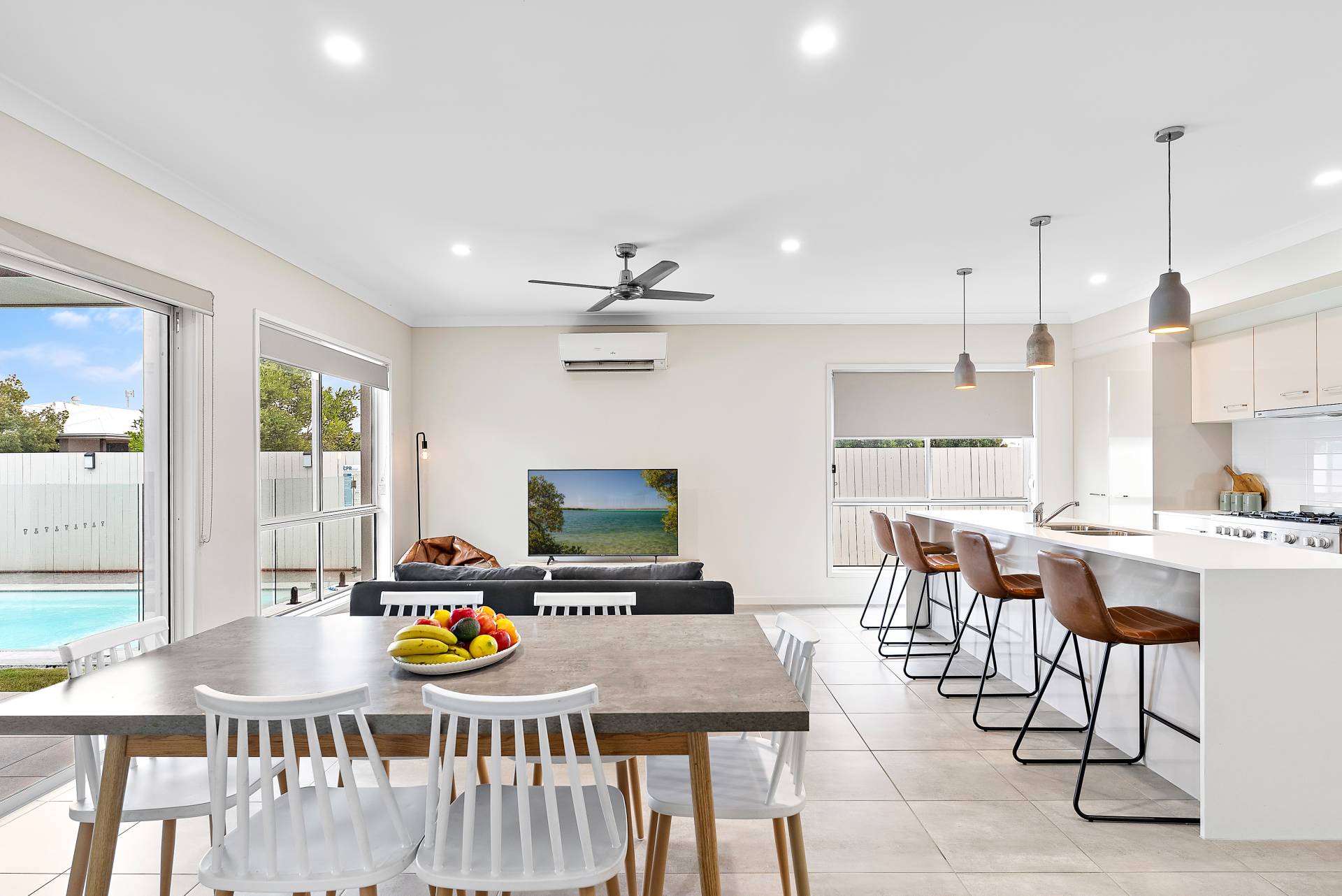 Open-plan living, kitchen and dining boasting views to the glistening pool