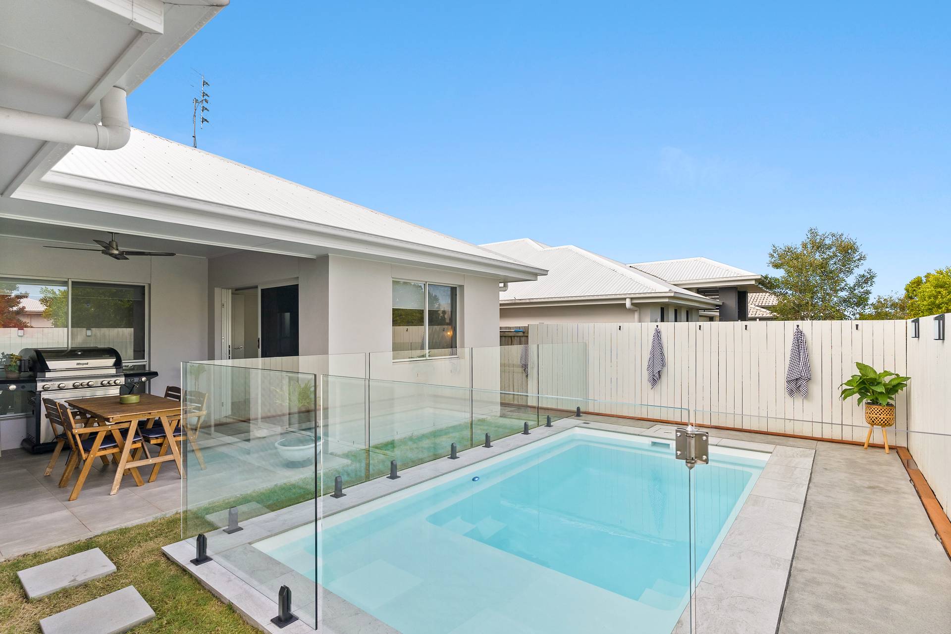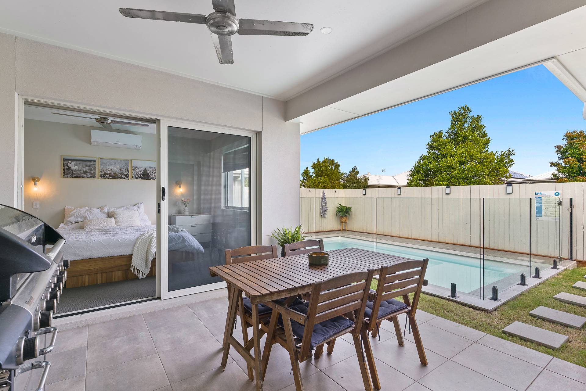 Spacious covered, decked alfresco with a stunning pool aspect