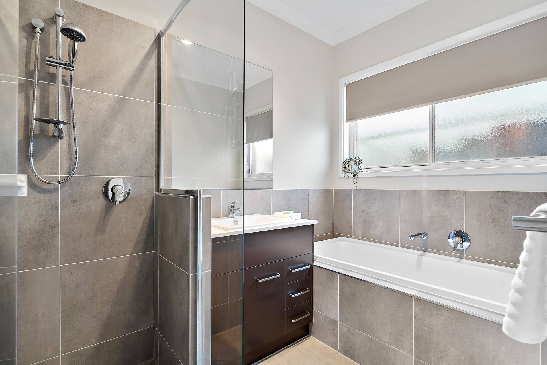 Ensuite bathroom with separate toilet, large shower, and twin vanity with black tap-ware and fittings