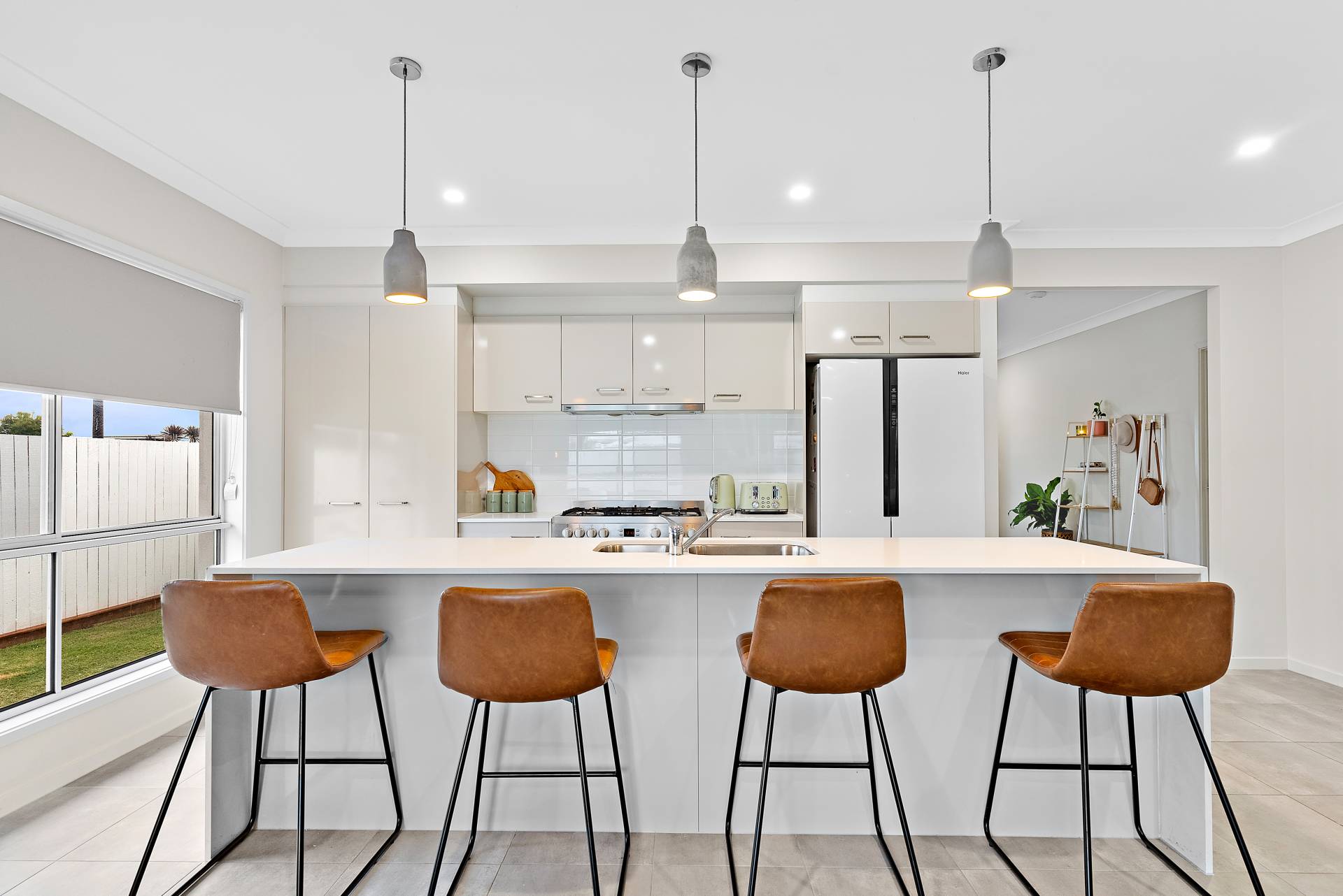 Modern kitchen with ample cupboard space, breakfast island with inbuilt sink, reconstituted, waterfall-edge stone bench tops and pendant lighting