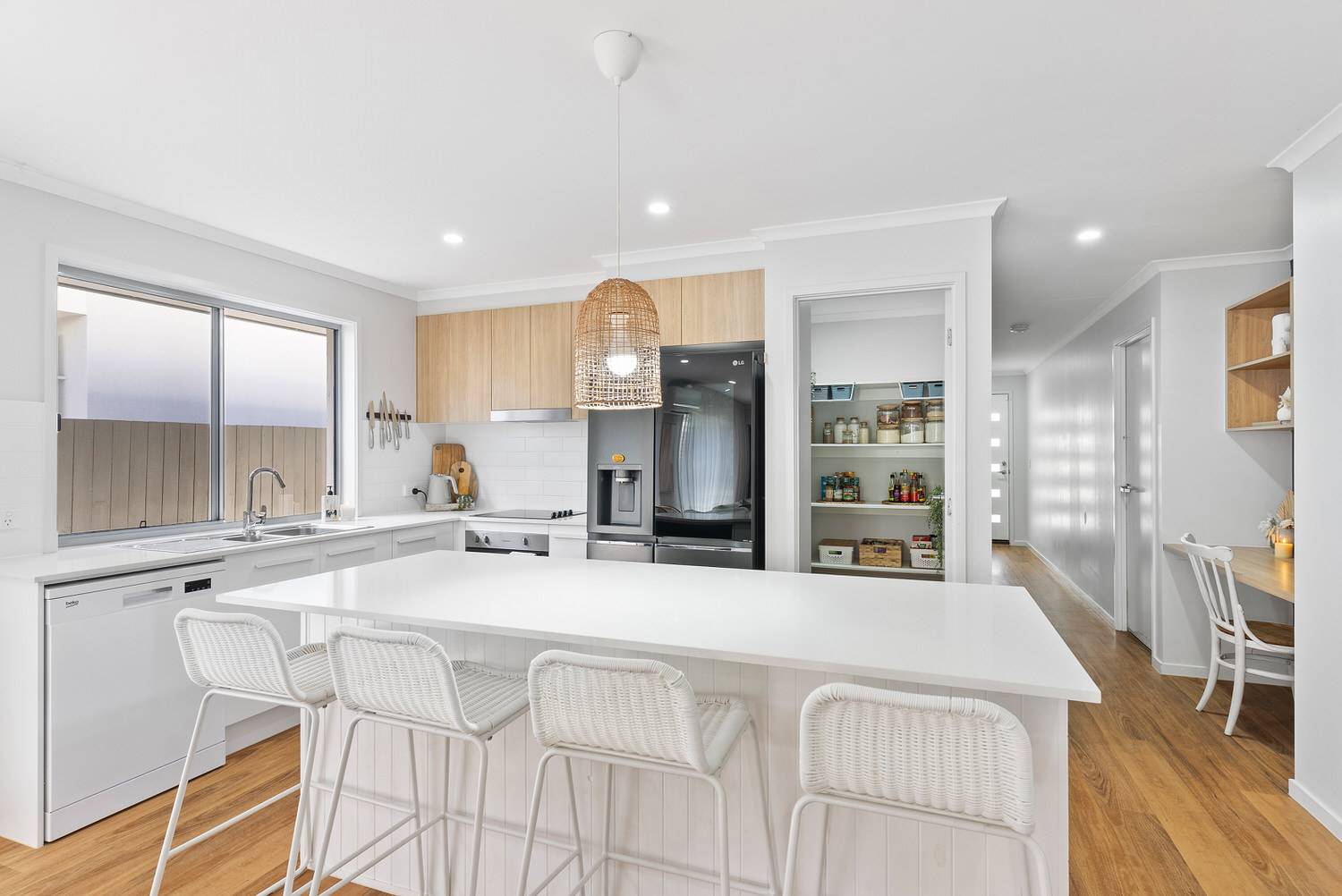 The well-appointed kitchen boasts modern appliances, ample storage space and a fantastic walk-in pantry. The breakfast bar is perfectly framed with rattan pendant lighting, perfect for enjoying casual meals or hosting gatherings. This versatile open-plan living is also equipped with a study nook, providing a fantastic space for home office, kids homework or a life admin.